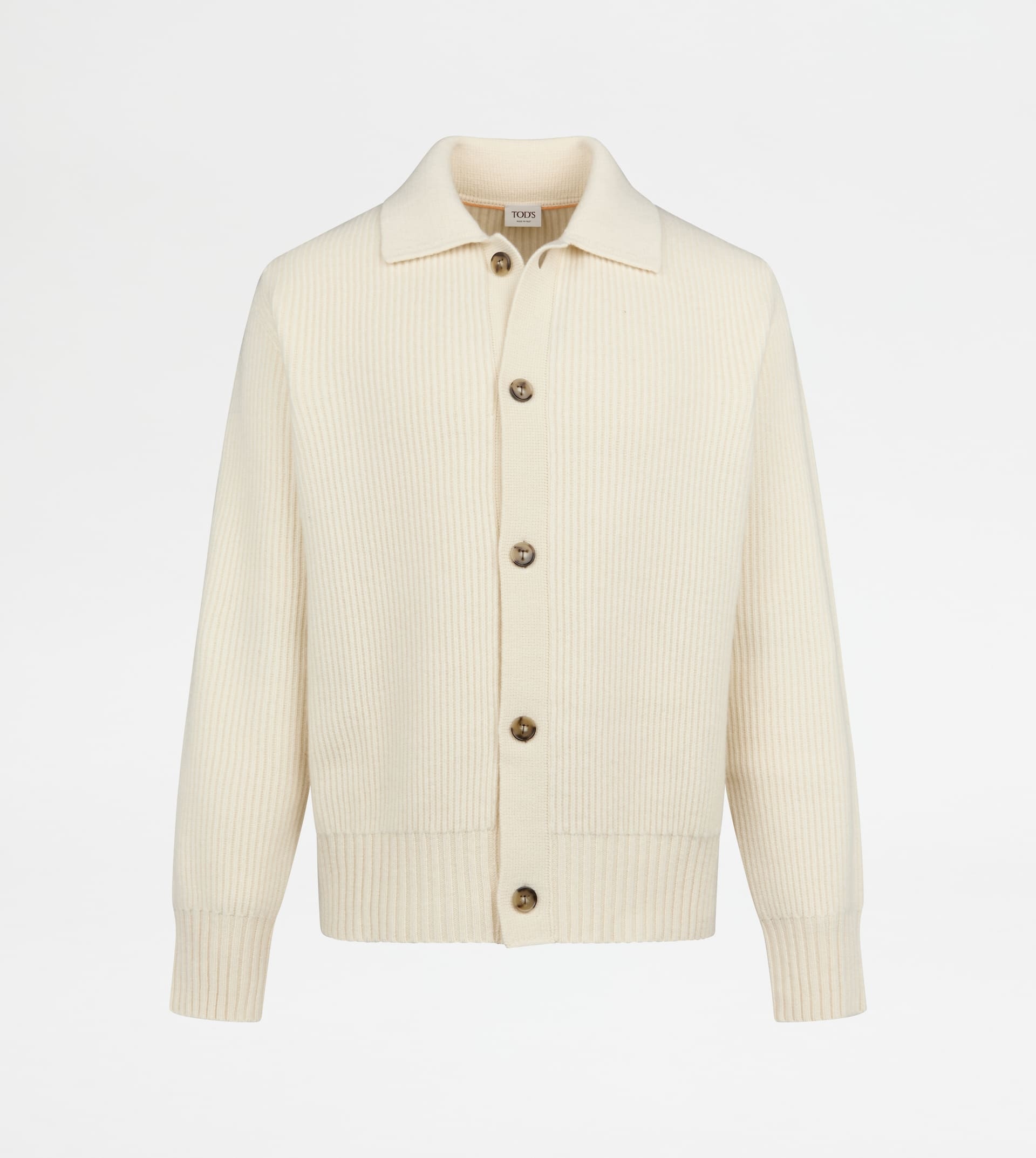 Cardigan in wool and cashmere, with polo shirt collar and ribbed knitting. Fastened by buttons with the classic T-stitching, it is enriched by the leather tag on the back with stamped Tod's logo. A refined autumn-winter wardrobe evergreen. - Made in Italy - Cashmere blend cardigan - Fitting: regular - Item composition: 70% wool, 30% cashmere, leather detailing - Maintenance and care cards included