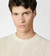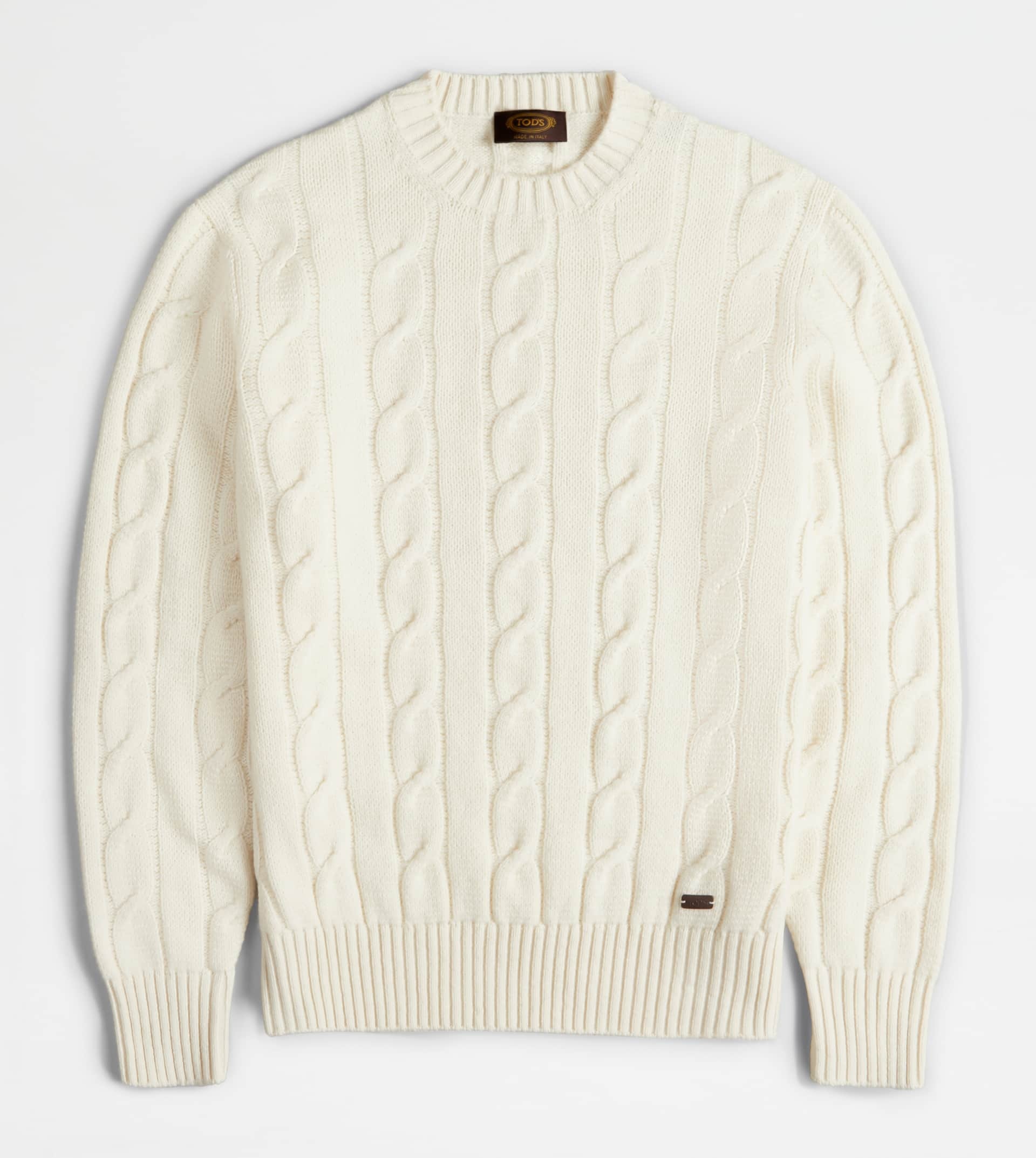 Round-neck pullover in cashmere blend knit with braided knitting. A refined autumn-winter wardrobe evergreen, enriched by the leather tag on the bottom with stamped Tod's logo. - Made in Italy - Cashmere blend pullover - Item composition: 70% wool, 30% cashmere - Maintenance and care cards included