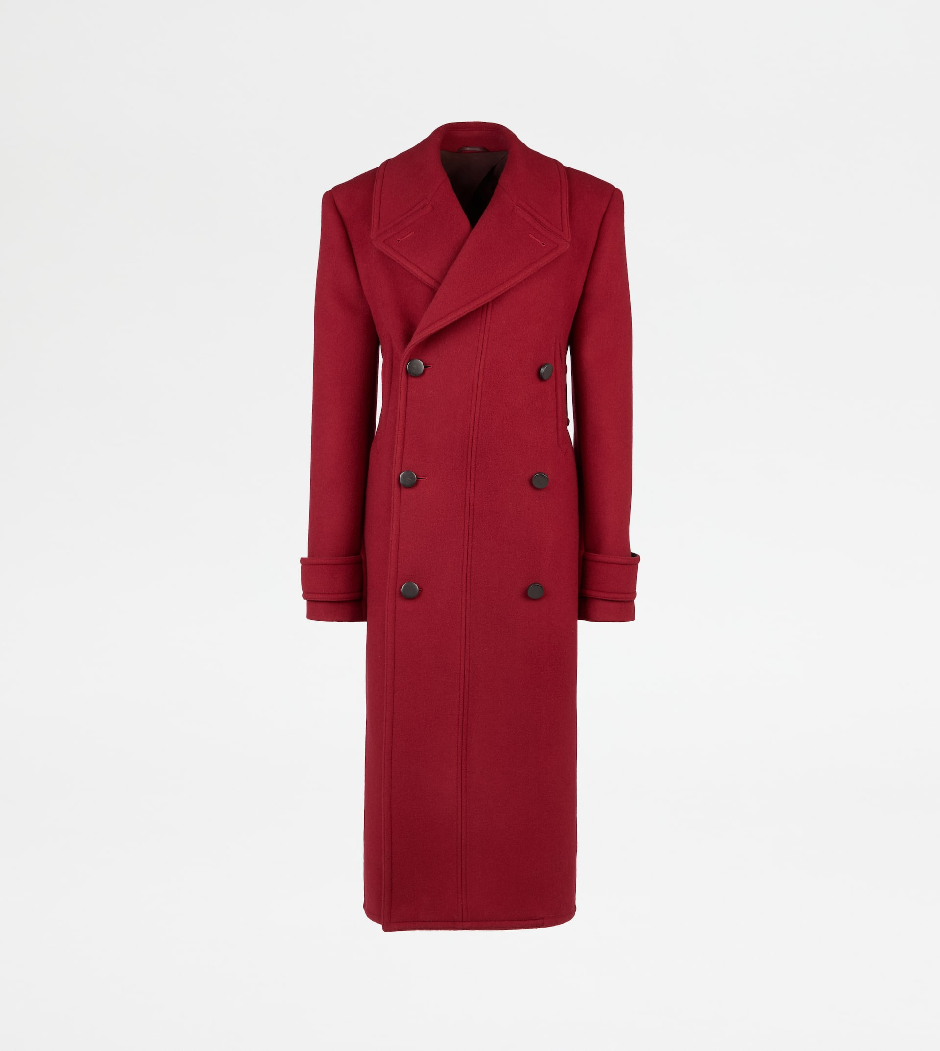 Characterized by wide lapels and leather-covered buttons, this double-breasted coat in wool features two welt pockets and a leather undercollar with stitching. Complemented by frogs on the cuffs, it is a versatile garment, with an elegant and sophisticated allure. - Made in Italy - Coat in wool - Fitting: regular - The model is 5' 9'' and wears size 38 (IT) - Item composition: 100% virgin wool, lining 100% viscose, ovine leather detailing - Maintenance and care cards included