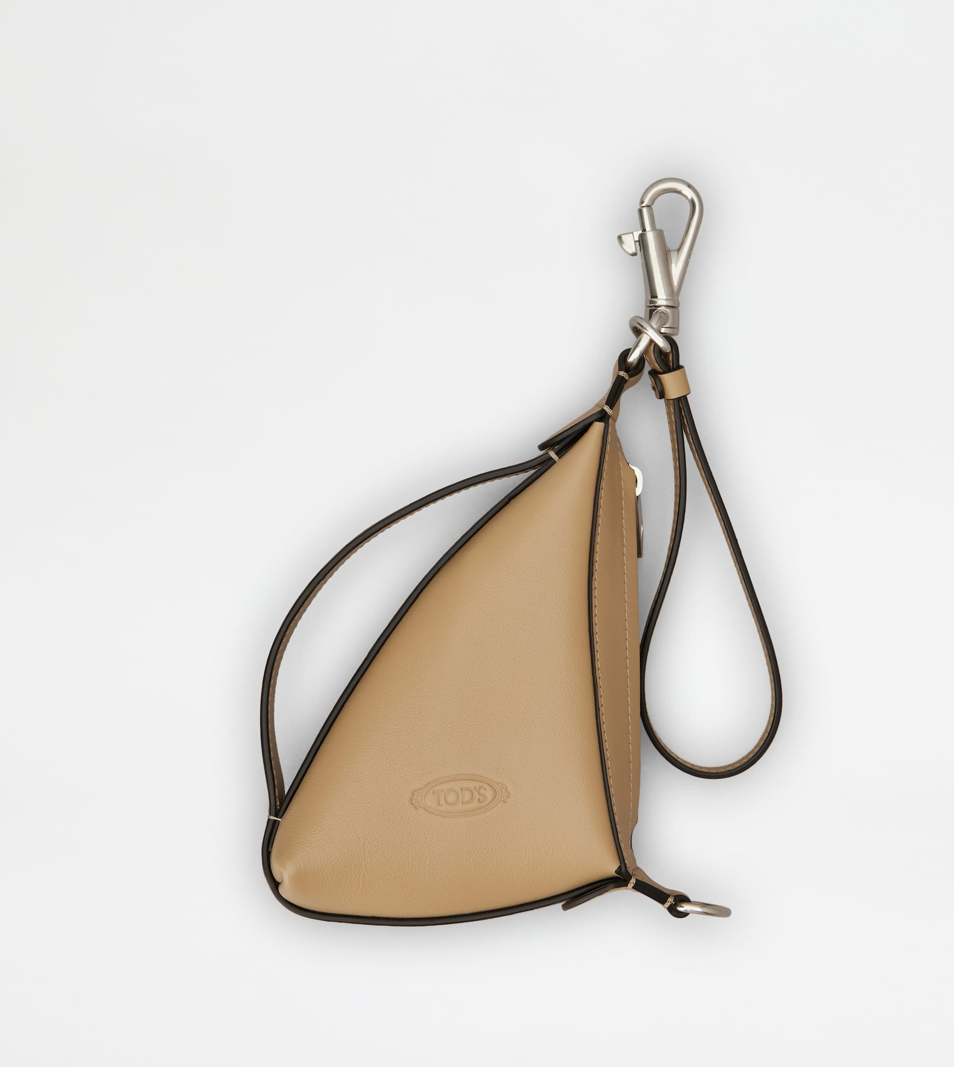 Inspired by the contemporary design of Tod's Meda Bag, this coin purse is crafted in soft calfskin leather. Featuring a fixed handle on the long side, it comes with a practical wristlet and metal snap hook for attaching it to your bag or belt. Closed with a zip, it comes with the Tod's logo stamped on the front. - Dimensions: L 4.9 ins x H 6.5 ins x D 2 ins - Made in Italy - Triangular coin purse - Item crafted in calfskin leather - Fixed wristlet - Snap hook - Tod's logo stamped on the front - Zip closure - Maintenance and care cards included