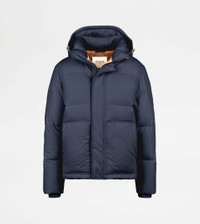 Down jacket in micro fiber with adjustable hood. Featuring maxi pockets with suede piping, it comes with wind-proof cuffs and a zip, concealed snap fastening. A functional yet refined urban garment, complemented by the Tod's monogram hand-embroidered on the shoulders. - Made in Italy - Hooded down jacket - Fitting: regular - The male model is 6' 2'' and wears size M (IT) - Item composition: 51% polyamide, 49% polyester, body lining 100% cotton, sleeve lining 100% polyester, leather detailing, padding 90% down, 10% feathers, class I feathers - Maintenance and care cards included
