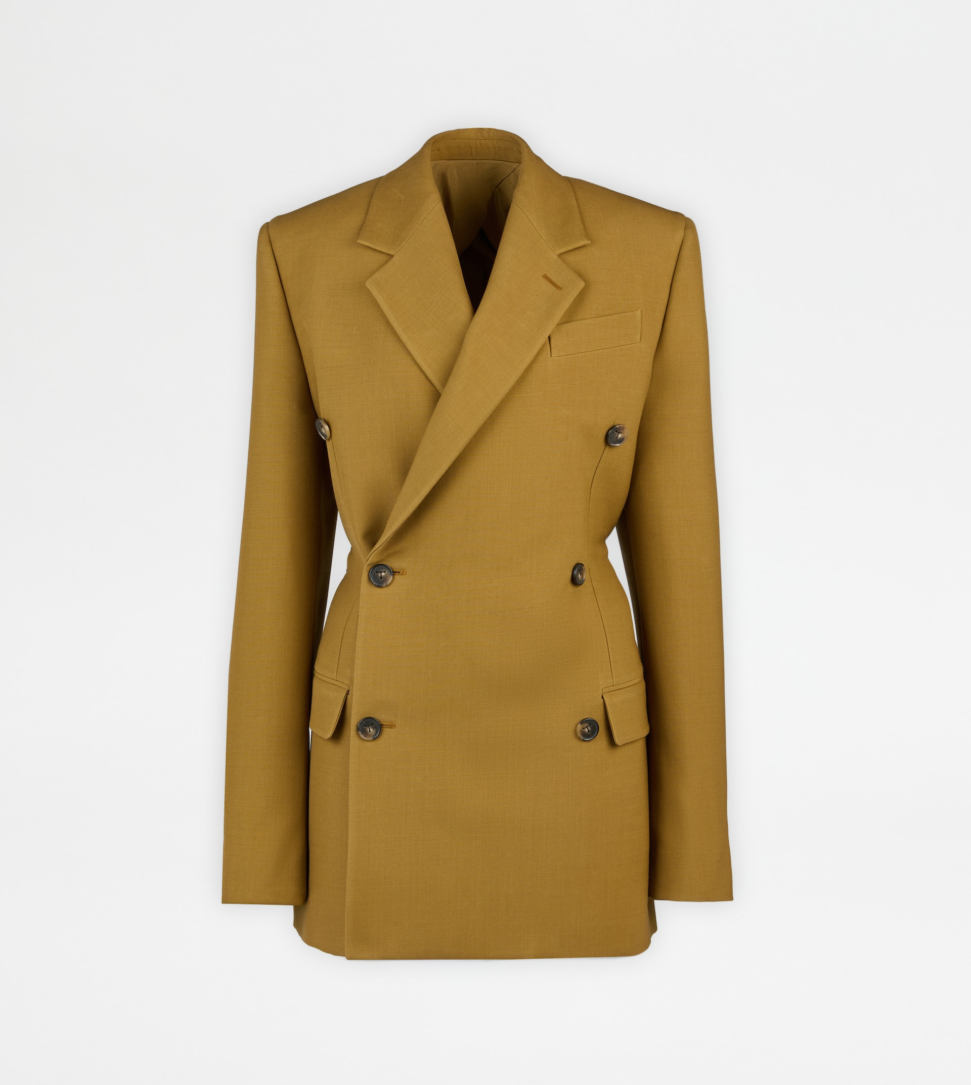 Double-breasted jacket in wool with lapels and leather belt on the back. Fastened with buttons with the distinctive T-stitching, it features a breast pocket and two flap pockets. Perfect for the contemporary office look. - Made in Italy - Jacket in wool - Fitting: regular - The model is 5' 9'' and wears size 38 (IT) - Item composition: 100% virgin wool, lining 100% cotton, second lining 100% viscose, belt in leather - Maintenance and care cards included