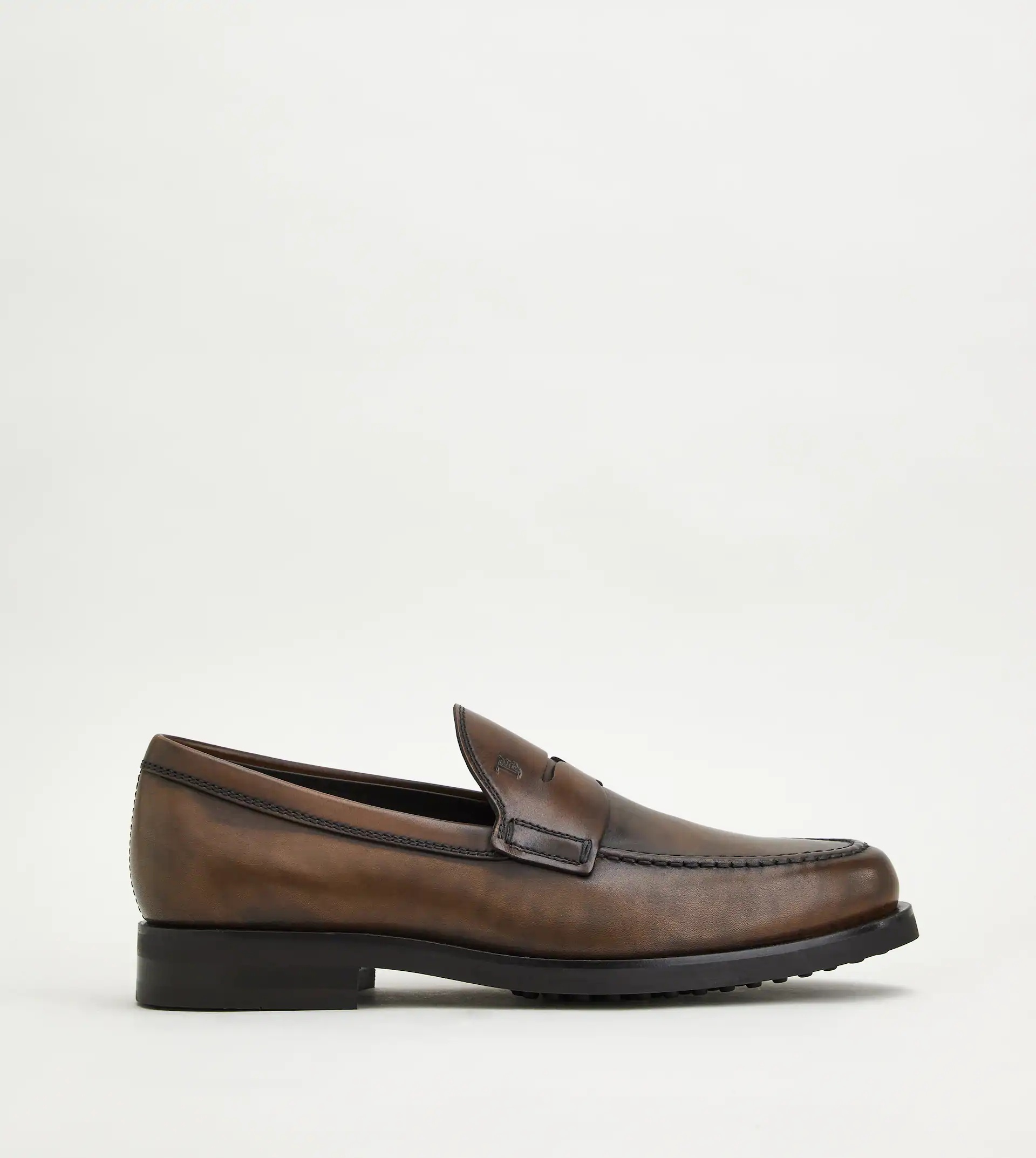 Loafers in antiqued semi-glossy leather with penny bar, stamped Tod's monogram and rubber outsole with embossed pebbles. - Made in Italy - Tod's men's loafers - Leather upper - Stamped Tod's monogram - Exposed hand stitching - Penny bar - Rubber outsole with embossed pebbles - Care and maintenance instructions included - Branded dustbag included