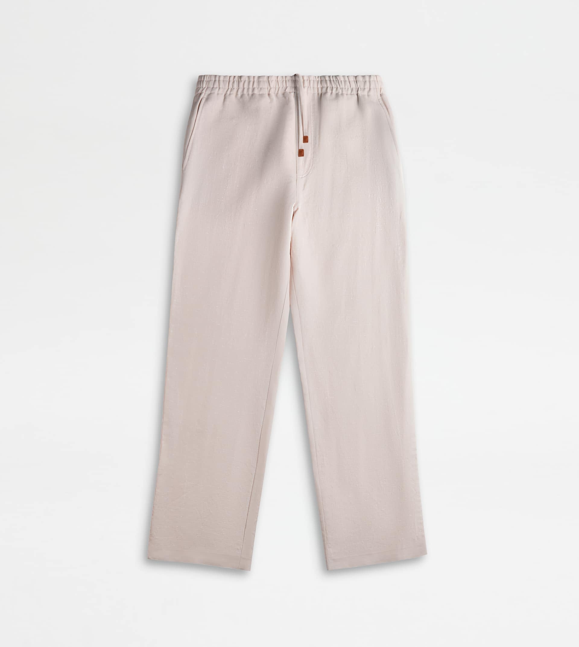 Pants with drawstring, crafted in linen blend cotton. Featuring an elastic waistband, they come with slanted front pockets and the leather Tod's tag on the back pocket. A true spring-summer look passe-partout. - Made in Italy - Pants with drawstring - The model is 6' 2'' and wears size M (IT) - Item composition: 52% cotton, 48% linen, lined parts 100% cotton, leather detailing - Fitting: regular - Maintenance and care cards included