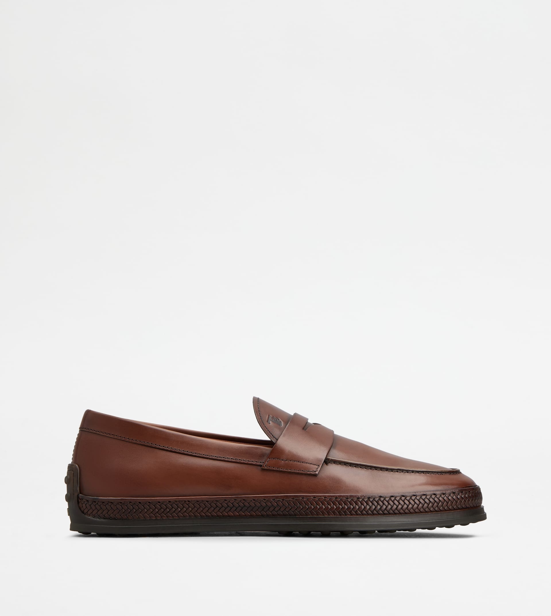 Characterized by a rubber pebble outsole and an elegant woven piping, these loafers are crafted in calfskin leather. Featuring a classic penny bar and the stamped Tod's monogram, they interpret a refined urban taste. - Men's Loafers - Calfskin leather upper - Penny bar - Stamped Tod's monogram - Leather insole - Rubber outsole with rubber pebbles - Maintenance and care cards included - Branded dustbag