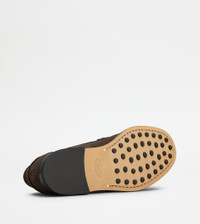 Loafers in soft nubuck with penny bar and stamped Tod's monogram. Characterized by a slightly gathered toe, they feature a leather outsole with rubber injection. - Made in Italy - Women's loafers - Nubuck upper - Stamped Tod's monogram - Leather lining and insole - Leather outsole with rubber injection - Maintenance and care cards included - Branded dustbag
