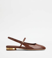 Characterized by a covered heel, with a circular shape, these Mary Janes feature two straps, an elastic slingback and an adjustable instep strap with enameled mini T Timeless accessory. Crafted in patent calfskin leather, with a leather outsole, they combine elegance and comfort. - Made in Italy - Slingback in leather - Patent calfskin leather upper - Double strap - Enameled mini T Timeless accessory - Leather lining and insole - Covered heel, with rubber insert - Leather outsole - Maintenance and care cards included - Branded dustbag