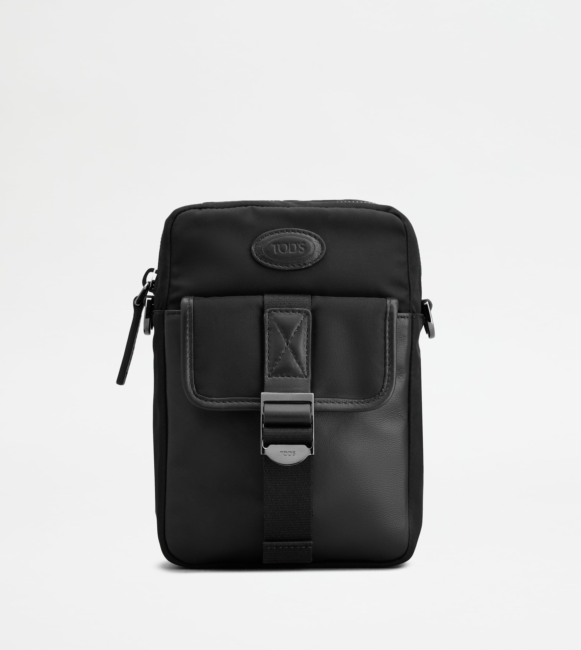 Mini bag phone holder in nylon and nappa leather, with adjustable and removable shoulder strap. Closed with zip, it features a front pocket with flap and branded metal buckle. A functional and refined accessory at once, with the Tod's logo stamped on the front. - Dimensions: L 5.7 ins x H 8.3 ins x D 3 ins - Adjustable and removable shoulder strap: height (drop) 16.1-30.7 ins, length 39-66.9 ins - Made in Italy - Phone holder - Item crafted in nylon - Ovine nappa leather inserts - Tod's logo stamped on the front - Front pocket with flap and metal buckle - Zip closure - Fabric lining - Maintenance and care cards included - Branded dustbag