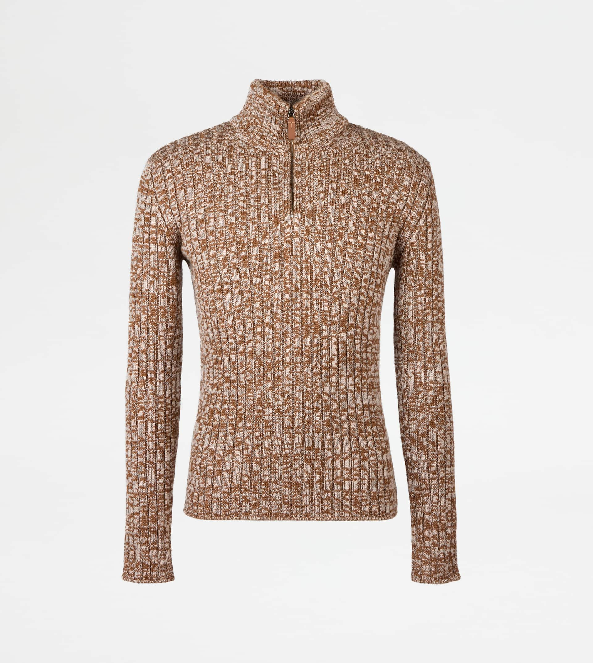 Half-neck pullover in mouline merino wool with ribbed knitting. Featuring the distinctive T-stitching on the zip pull, it comes with the leather Tod's tag applied on the back. - Made in Italy - Pullover in merino wool - Fitting: regular - Item composition: 100% wool, leather detailing - Maintenance and care cards included