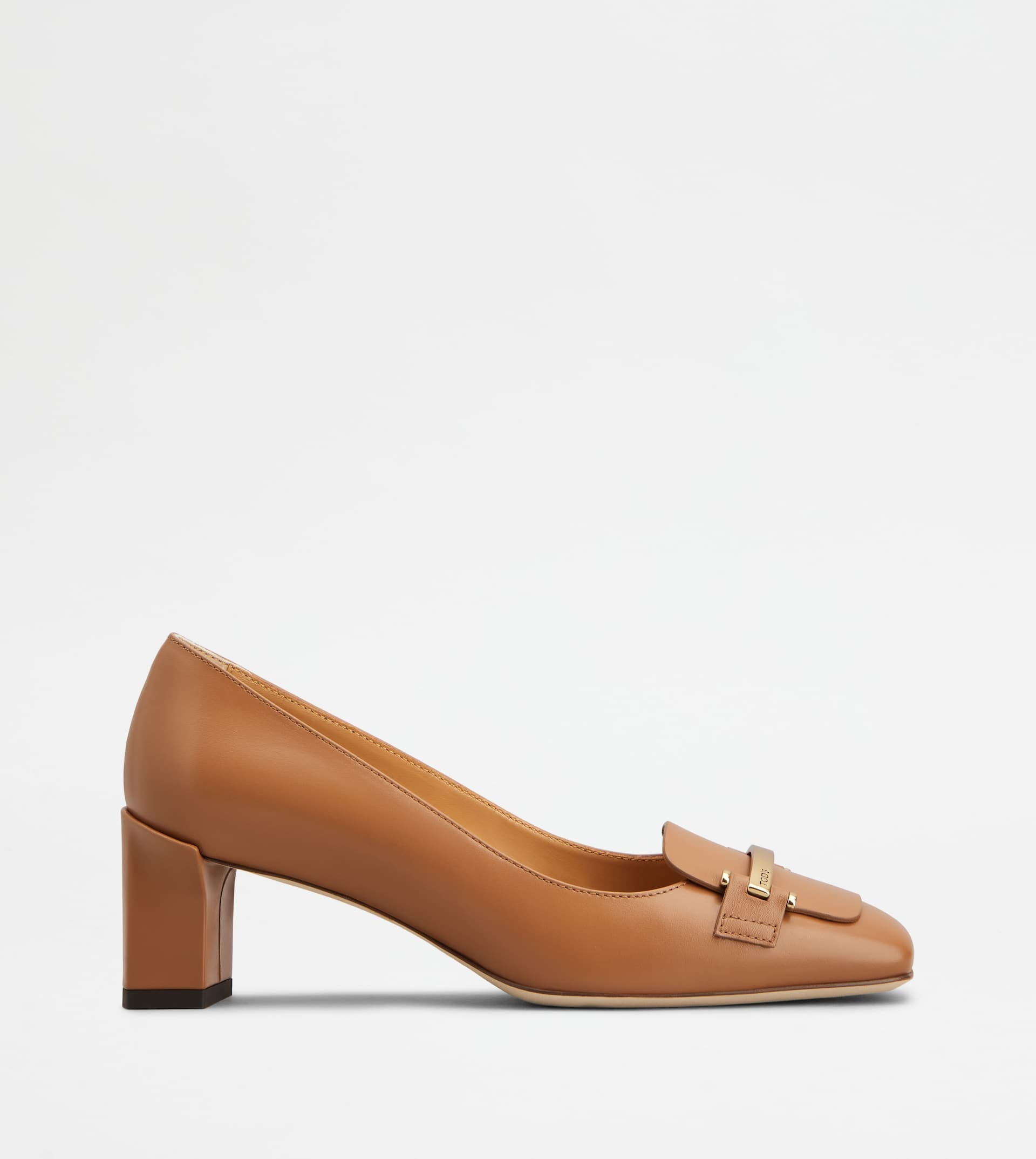 Pumps in precious calfskin leather, with branded metal bar secured on the side, geometric heel and leather outsole. - Made in Italy - Women's Tod's Pumps - Calfskin leather upper - Branded metal bar - Leather lining and insole - Covered heel 2 ins - Leather outsole - Maintenance and care cards included - Branded dustbag