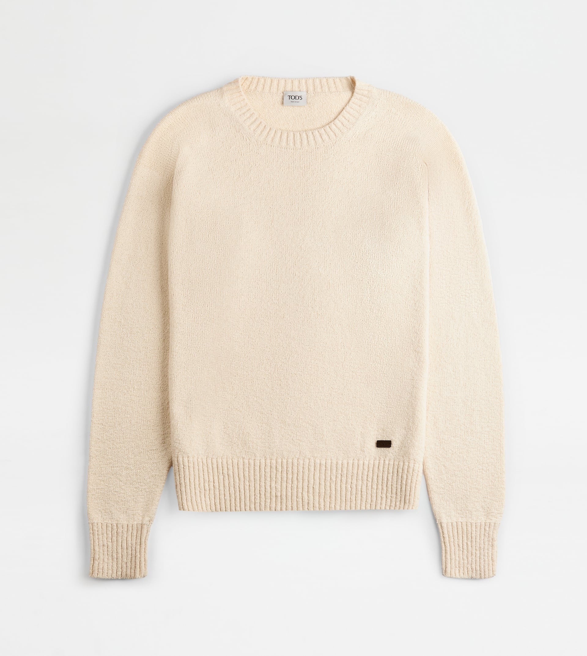 Seamless round-neck pullover in organic Nilo cotton knit, end result of meticulous manufacturing process that combines technology and craftsmanship for an exclusive and fine yarn. A refined wardrobe evergreen, with the leather Tod's tag on the bottom. - Made in Italy - Round-neck pullover in cotton - The model is 6' 2'' and wears size M (IT) - Item composition: 100% Nilo cotton, leather detailing - Fitting: regular - Maintenance and care cards included
