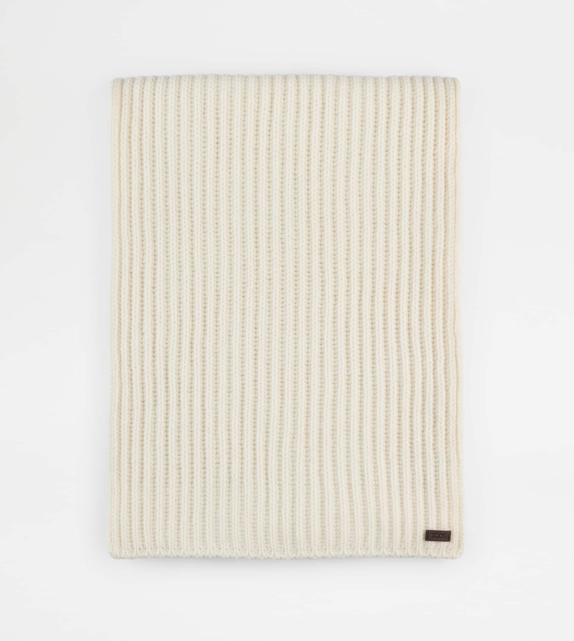 Scarf in cashmere with English rib knitting and leather Tod's tag applied on the side. Soft and warm, it is a versatile and refined accessory. - Made in Italy - Ribbed scarf - Composition: 100% cashmere - Length: 78.7 ins approx - Maintenance and care cards included
