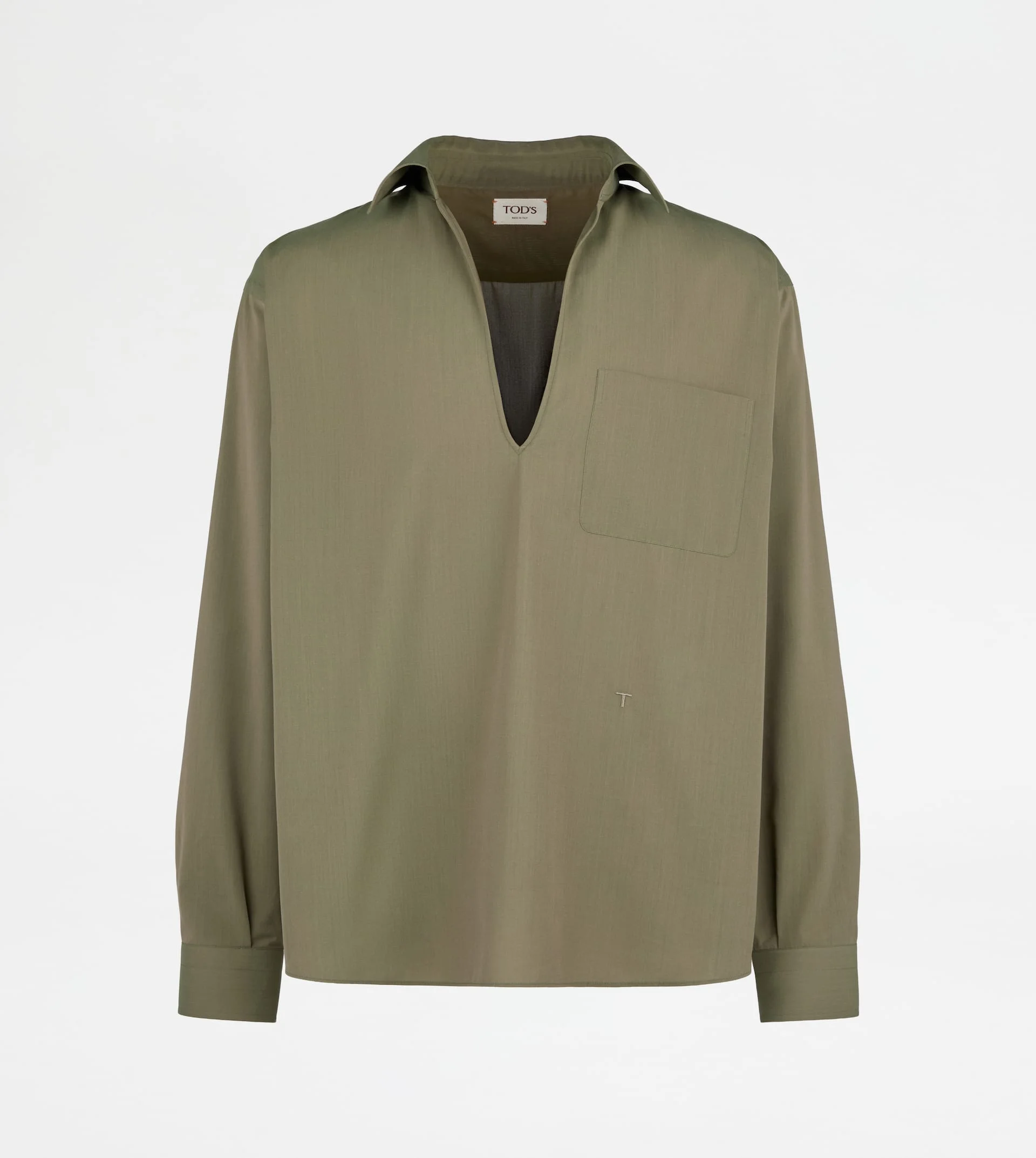 Buttonless shirt in silk. Characterized by a wide polo shirt style collar, it comes with an applied pocket and the Tod's monogram embroidered on the front. A garment with informal and timeless elegance. - Made in Italy - Polo-shirt - Fitting: over - The model is 6' 2'' and wears size M (IT) - Item composition: 100% silk - Maintenance and care cards included