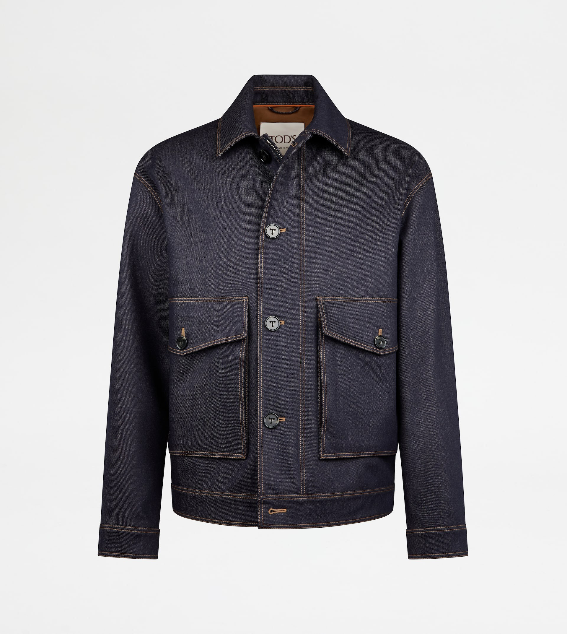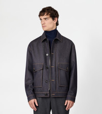 Jacket in refined pure wool denim, with water-repellent and windproof properties. Featuring a shirt collar and undercollar in leather, it comes with two maxi flap pockets with button. Fastened with a concealed zip and buttons with the distinctive T-stitching, it features the brand monogram hand-embroidered over the shoulders. An internal pocket complements the garment. - Made in Italy - Jacket in wool denim - Fitting: slightly boxy - The model is 6' 2'' and wears size M (IT) - Item composition: 100% wool with water-repellent and windproof membrane, interior 100% cotton, sleeve lining 100% cupro (striped jacquard twill) - Maintenance and care cards included