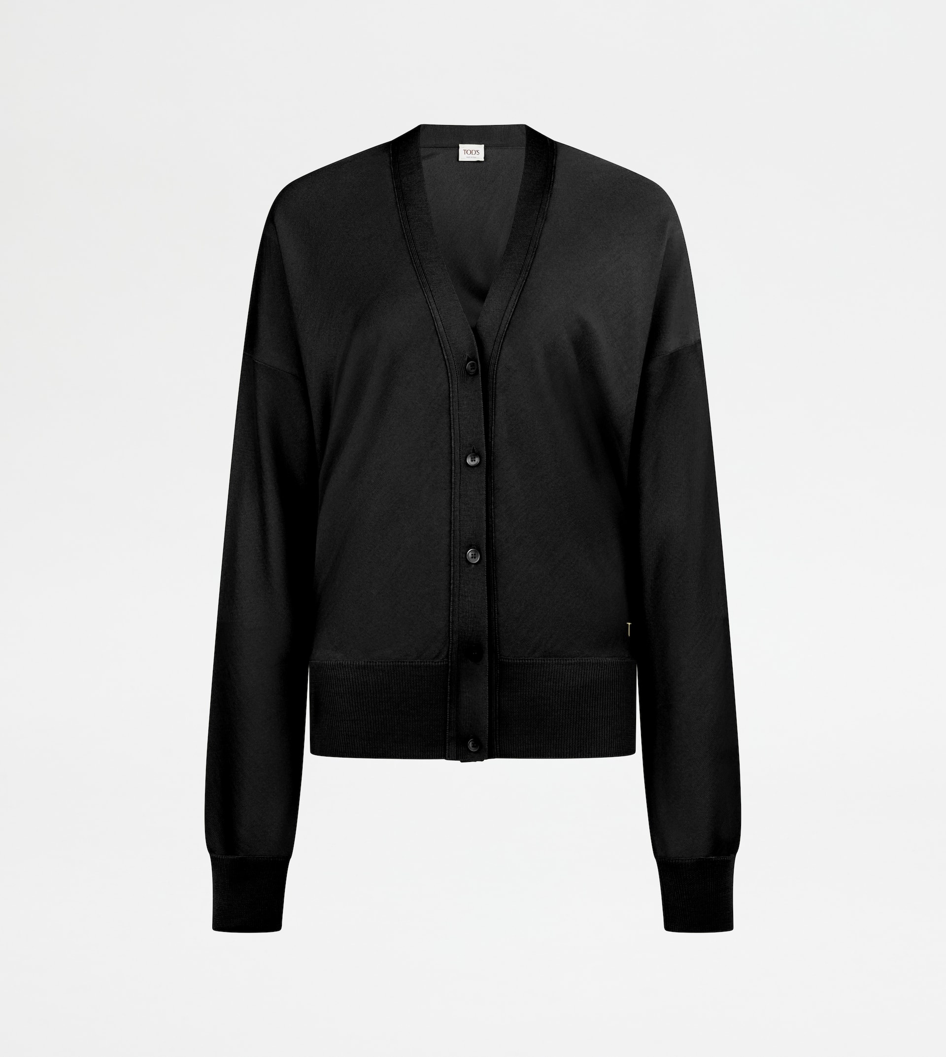V-neck cardigan in silk blend wool with lowered armholes and ribbed hems. Enriched by the Tod's monogram embroidered on the bottom, it interprets a casual elegance. - Made in Italy - Silk blend cardigan - Fitting: regular - Item composition: 70% virgin wool, 30% silk - Maintenance and care cards included