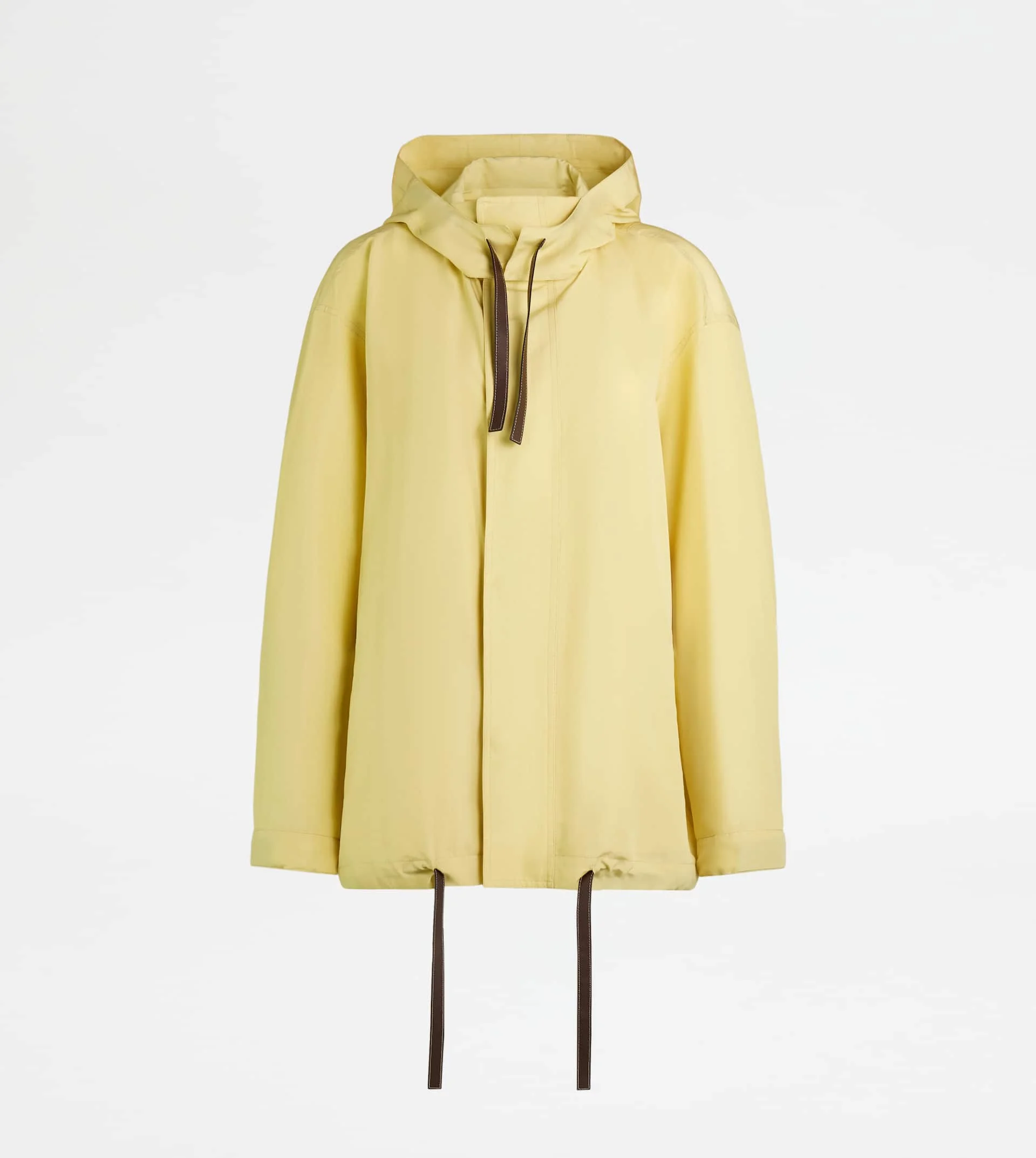 Over-fit silk blend windbreaker, with flat drawstring in leather and two pockets. Featuring a foldaway hood that can be stored inside the collar, it is fastened with zip and concealed snaps. Combination of elegance and functionality, the garment is complemented by the Tod's monogram hand-embroidered on the back. - Made in Italy - Windbreaker with hood - Fitting: over - Item composition: 55% polyester, 45% silk, lined parts 100% cotton, ovine leather detailing - Maintenance and care cards included