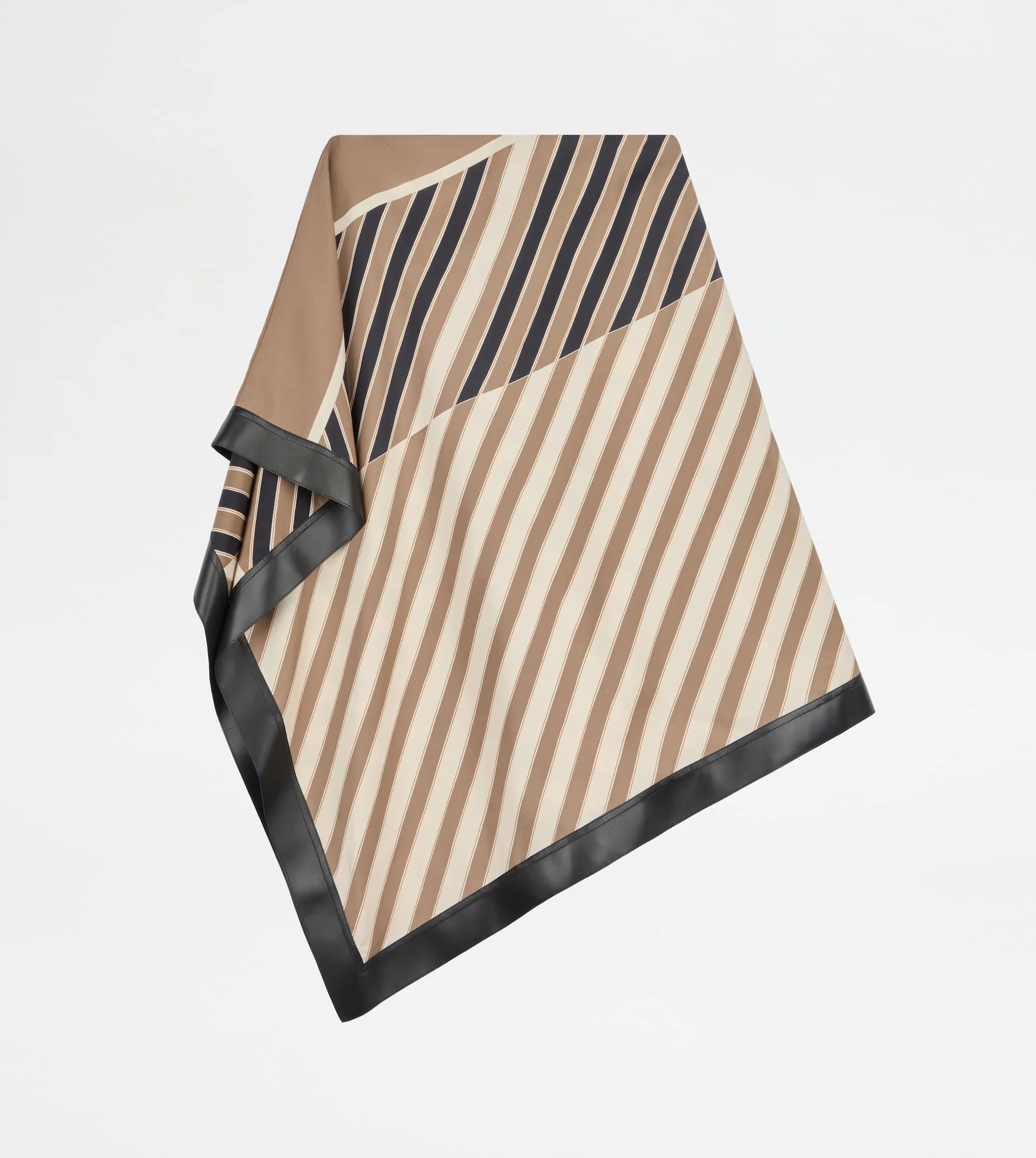 Foulard-skirt in printed silk with striped pattern and soft nappa leather hems. Fastened with an invisible zip, it interprets a sophisticated and casual elegance. - Fitting: regular - The female model is 5' 9'' and wears size 38 (IT) - Item composition: 100% silk, lambskin leather inserts - Made in Italy