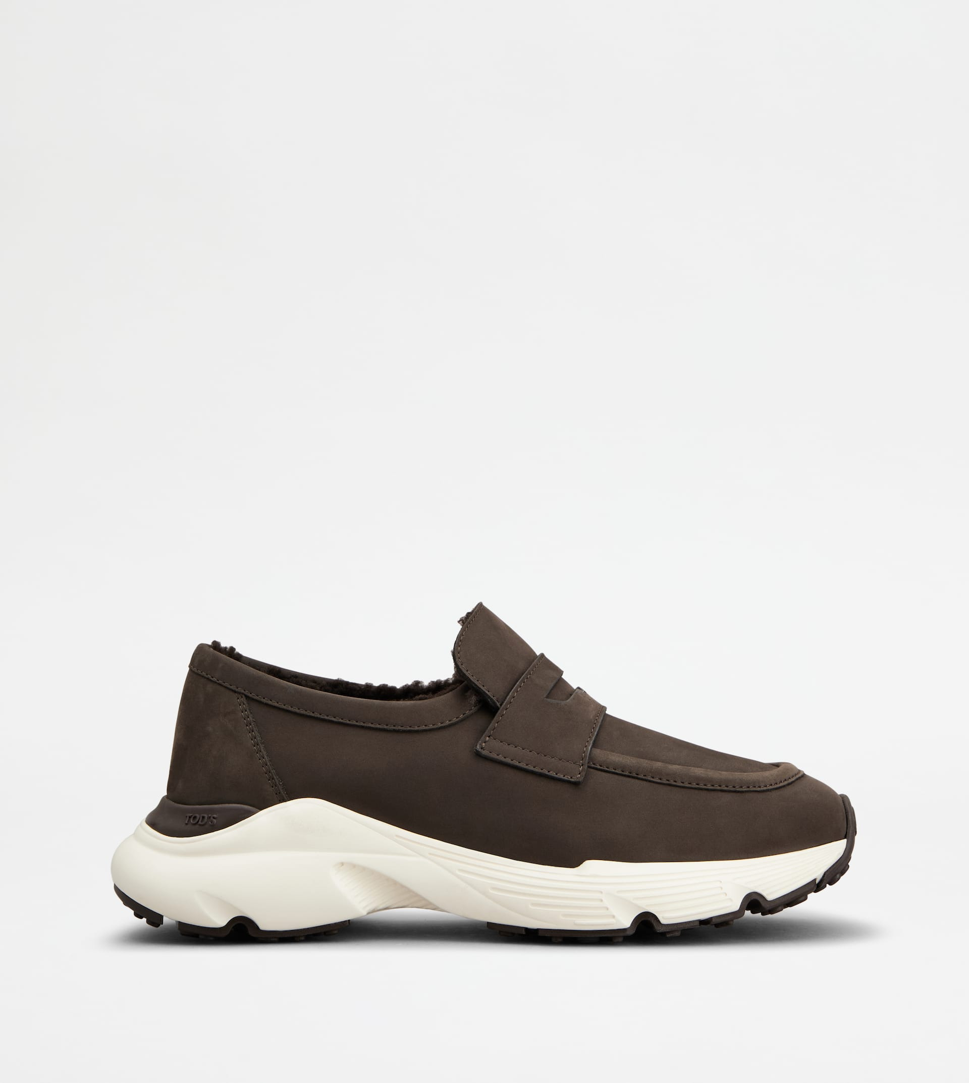 Characterized by a chunky rubber outsole, this wintery style features a loafer upper with a classic penny bar and shearling lining. Crafted in silky nubuck, it is a contemporary refined hybrid. - Made in Italy - Women's loafer sneakers - Calfskin nubuck upper - Penny bar - Sheepskin lining - Soft insole - Rubber outsole - Maintenance and care cards included - Branded dustbag