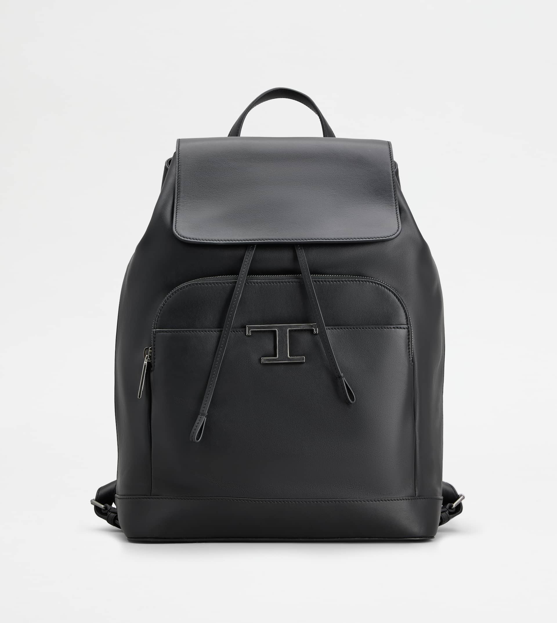 Backpack in calfskin leather, with a double front pocket enriched by the T Timeless accessory with leather inlay. Closed with two magnetic buttons, it features a practical drawstring compartment, handle strap and two adjustable shoulder straps. - Dimensions: L 11.8 ins x H 15.7 ins x D 5.9 ins - Handle strap: height (drop) 3.9 ins - Adjustable shoulder straps - Made in Italy - Men's backpack - Item crafted in calfskin leather - Zipped double front pocket - Metal T Timeless accessory with leather inlay - Tod's logo stamped on the back - Magnetic button and drawstring closure - Fabric interior - Zipped internal pocket - Branded metal feet - Maintenance and care cards included - Branded dustbag
