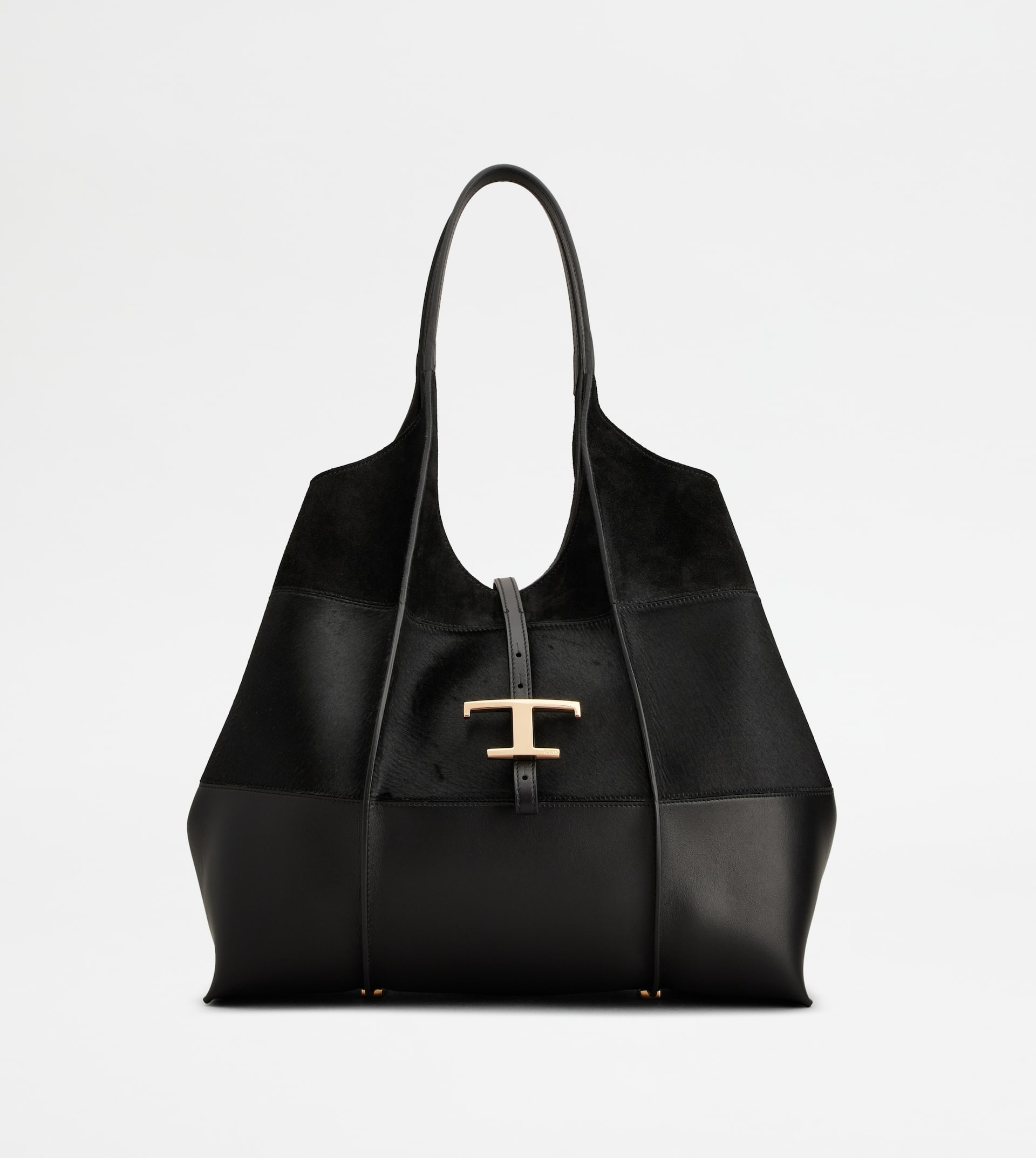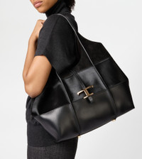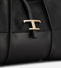 Medium shopping bag in leather, with pony effect and suede inserts. Featuring the iconic branded metal T Timeless pendant, it comes with vertical ribbing and two practical handles. The compartment, with adjustable size, is complemented by a removable pouch. - Dimensions: L 18.5 ins (extended compartment) x H 11.4 ins x D 5.5 ins - Handles: height (drop) 10.2 ins - Made in Italy - Shopping bag in leather - Item crafted in calfskin leather - Suede and pony effect leather insert - Branded metal T Timeless pendant - Strap and snap button closure - Removable internal pouch in smooth leather - Metal feet - Maintenance and care cards included - Branded dustbag