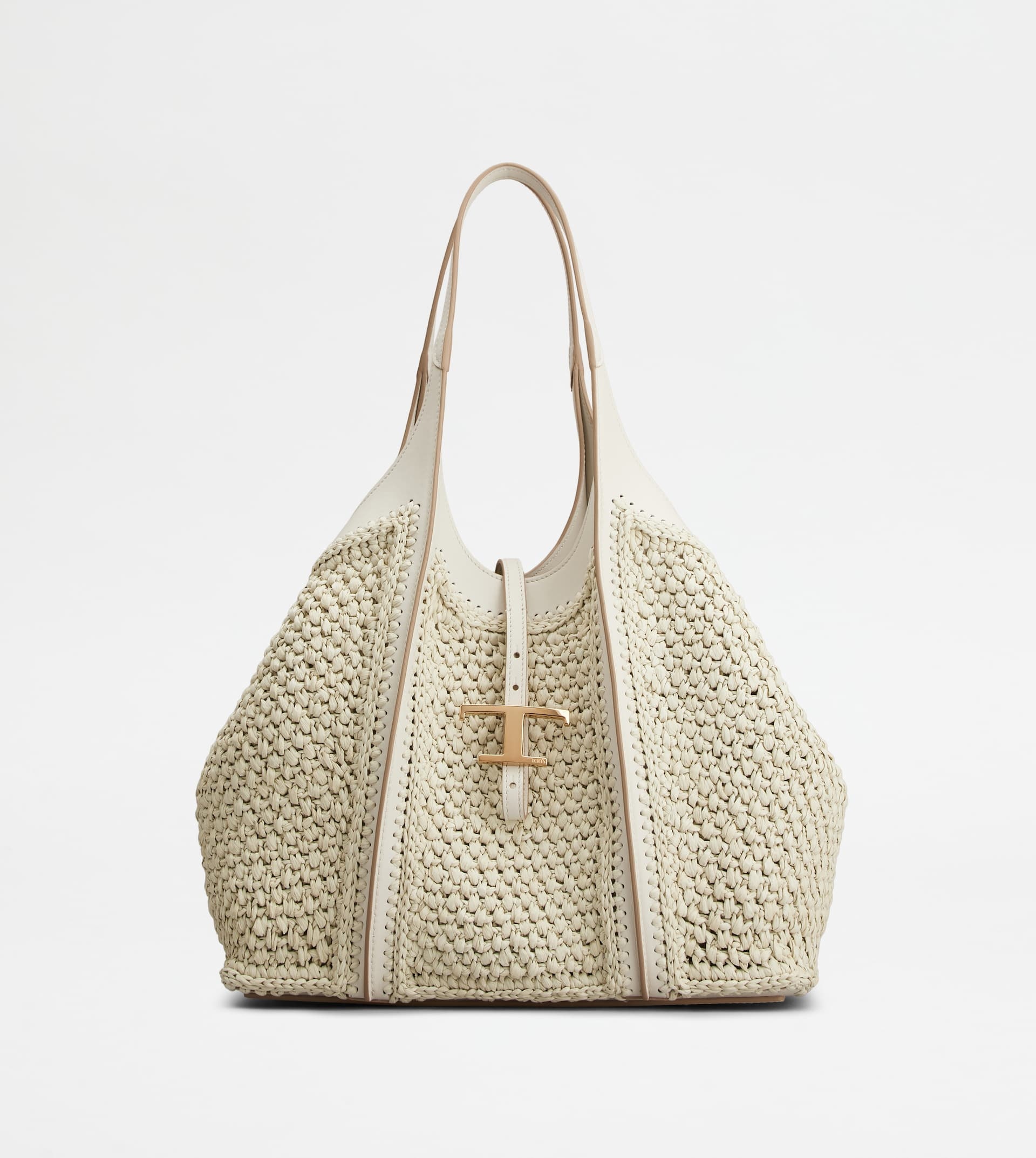 Shopping bag with sinuous lines, crafted in raffia with leather inserts and handles. Branded metal T Timeless pendant accessory, wide internal compartment with removable leather pouch. - Dimensions: 18.5 x 11.4 x 5.5 ins - Two handles in leather - Made in Italy - Women's Tod's Timeless Shopping Bag - Item crafted in raffia - Leather inserts - Branded metal T Timeless pendant accessory - Strap and snap button closure - Removable leather zipped pouch - Maintenance and care cards included - Branded dustbag
