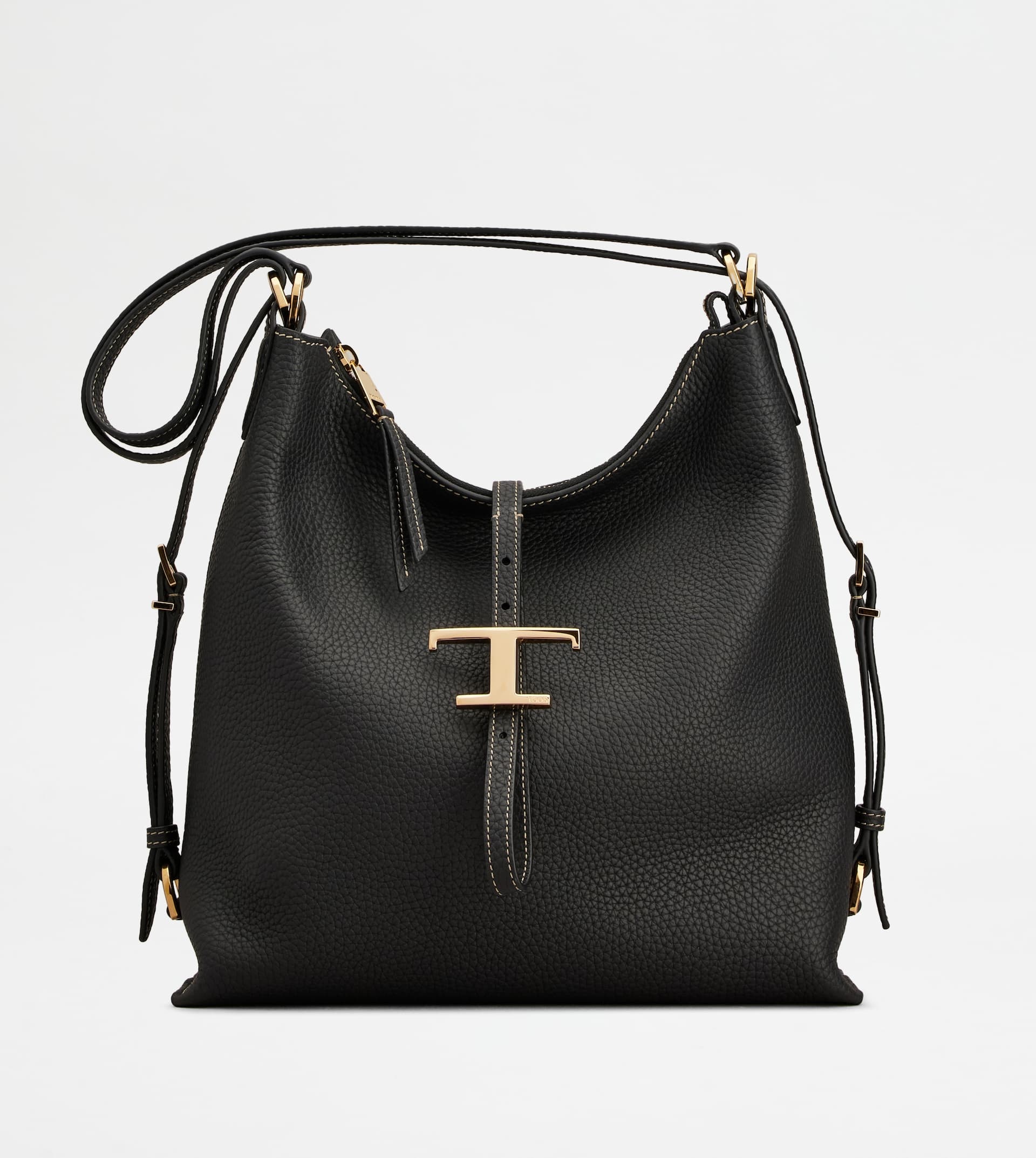 A multipurpose bag that turns into a backpack by adjusting the shoulder strap. Designed for extra functionality in your everyday look, it is crafted in exposed-grained leather, with an unlined construction that makes it practical and lightweight. The zip closure is enriched by the elegant metal T Timeless pendant. - Dimensions: L 11 ins x H 12.4 ins x D 4.3 ins - Handle-shoulder strap: height (drop) 10.8 ins - Made in Italy - Backpack-bag in leather - Item crafted in bovine leather - Branded metal T Timeless pendant - Zip closure - Maintenance and car cards included - Branded dustbag