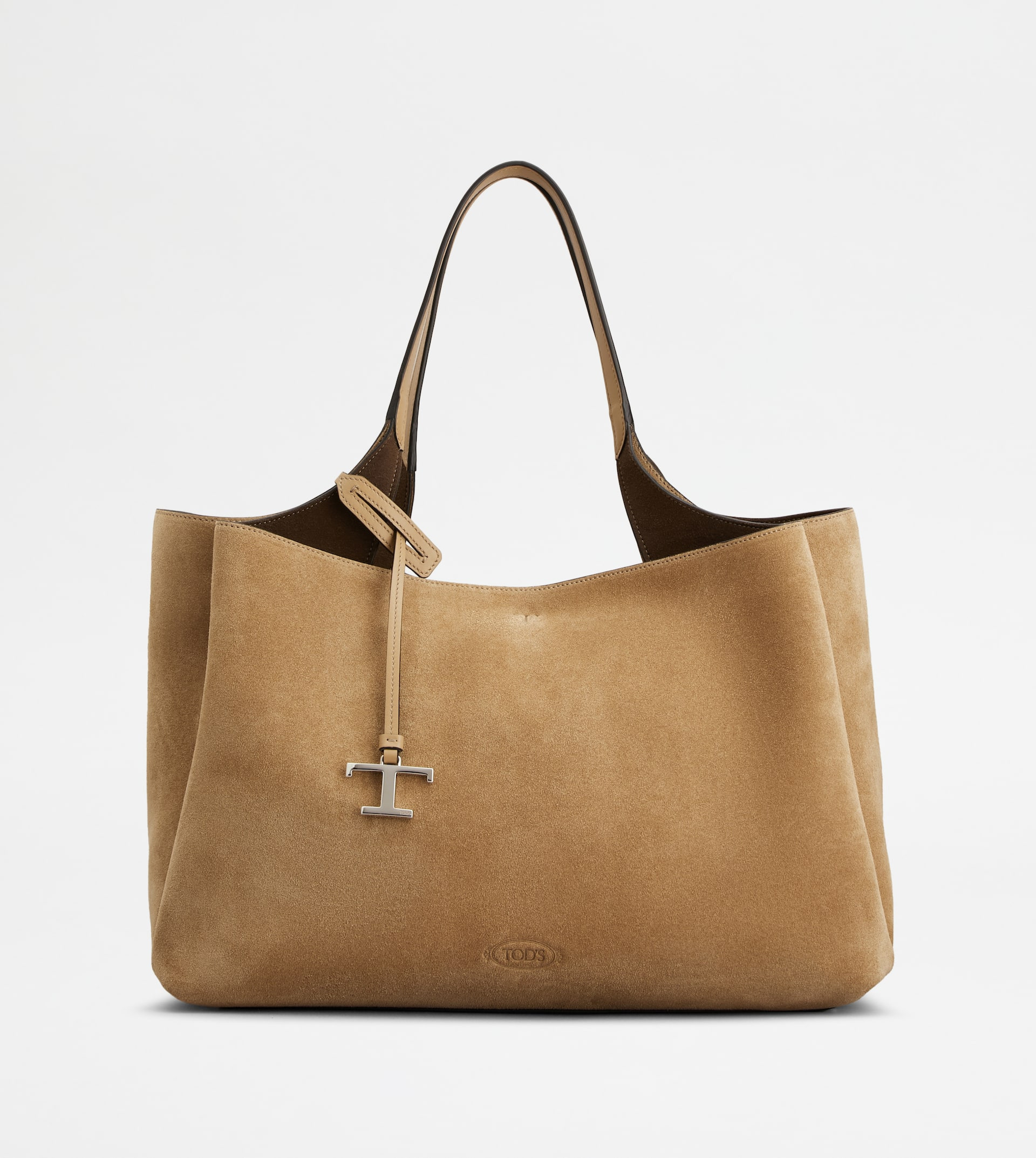 Flowing lines and elegant play of volumes characterize this bag in calfskin suede, with flat handles and Tod's logo stamped on the front. The interior, wide and functional, features two compartments separated by zipped pockets. A contemporary creation enriched by distinctive iconic detailing, such as metal T Timeless pendant and T-stitching. - Dimensions: L 16.1 ins x H 10.2 ins x D 7.5 ins - Handles: height (drop) 10.2 ins - Made in Italy - Tod's Bag - Item crafted in calfskin suede - Tod's logo stamped on the front - Removable pendant with metal T Timeless accessory - Metal snap hook and ring closure - 2 internal flat zipped pockets - Branded metal feet - Maintenance and care cards included - Branded dustbag
