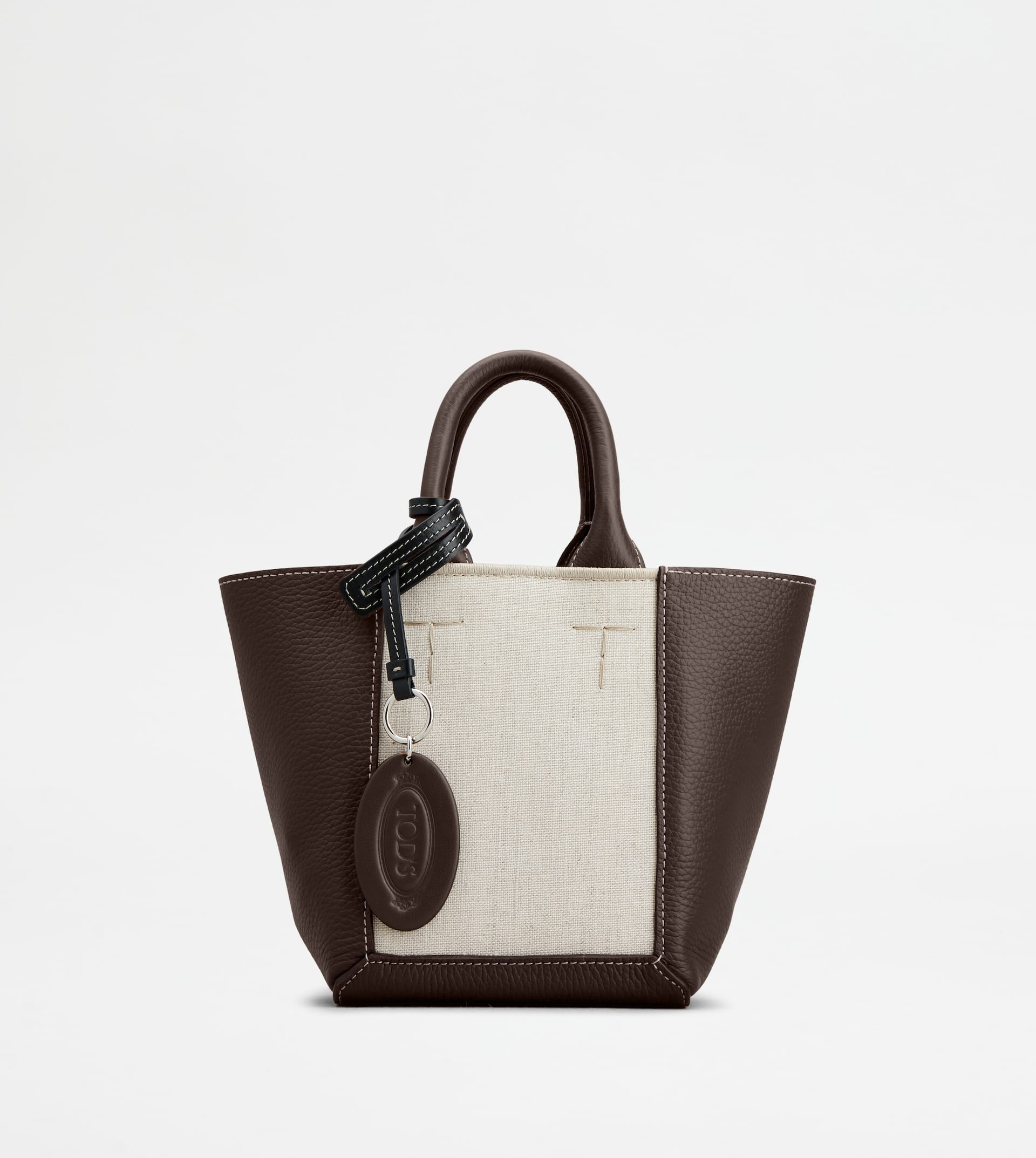TOD'S DOUBLE UP SHOPPING BAG IN LEATHER AND CANVAS MINI - BROWN, OFF WHITE