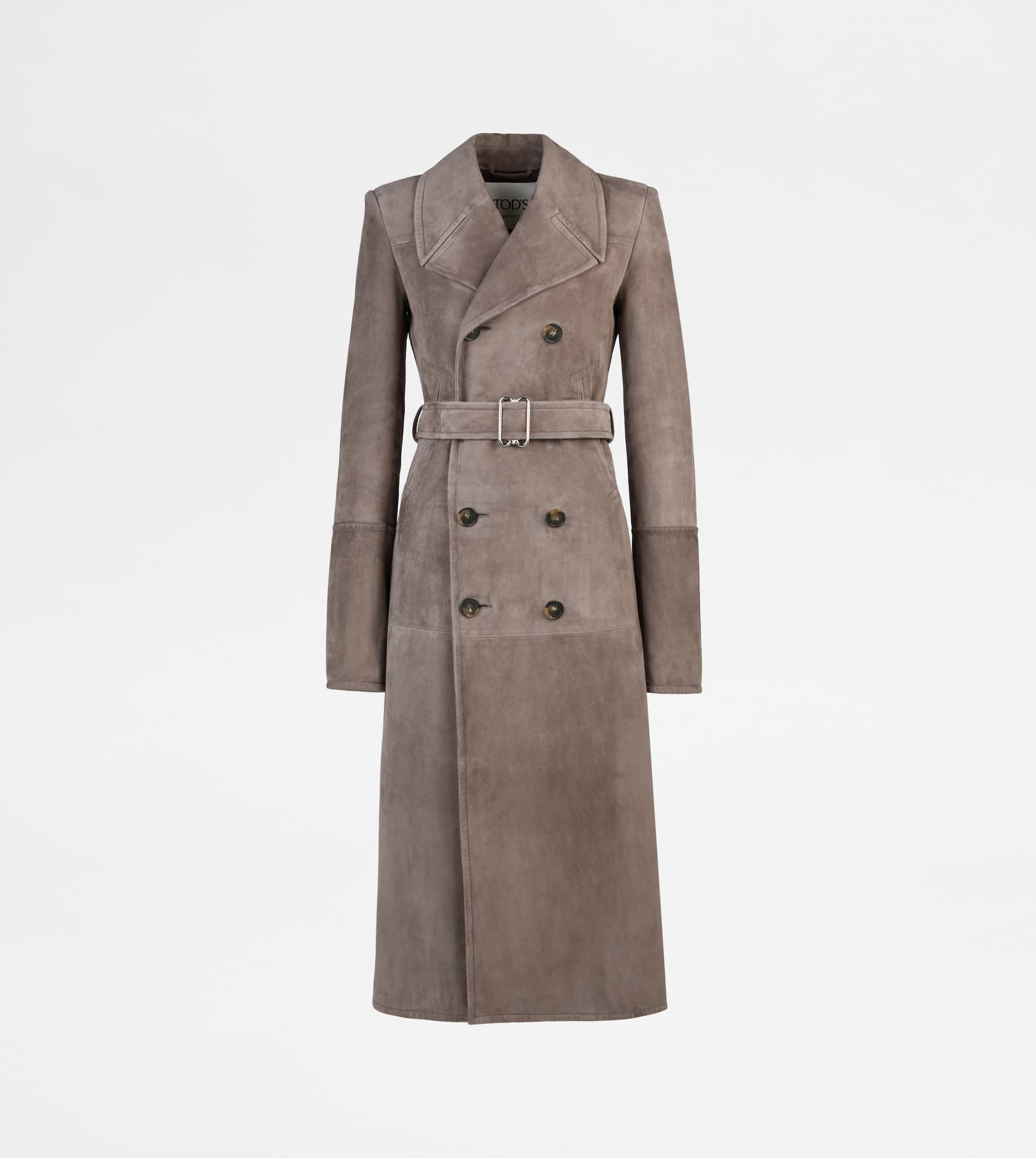 Slim-fit double-breasted trench coat in Pashmy suede, with anti-drip and anti-stain treatment. A unique material with an exceptional softness, lightweight thanks to its thin thickness yet compact and resistant. Characterized by lapels and waist belt, the garment features buttons with the distinctive T-stitching, two welt pockets and the Tod's monogram embroidered on the back. - Made in Italy - Suede trench coat - Fitting: slim - The model is 5' 9'' and wears size 38 (IT) - Item composition: 100% ovine leather, lining 100% cotton, second lining 100% viscose - Maintenance and care cards included