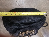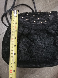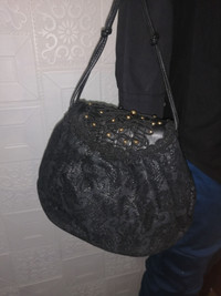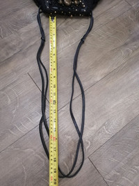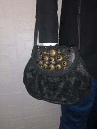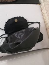 This is a fabulous genuine leather black circle crossbody with black patent leather trim and base. This bag is designed by Italian designer Braccialini. There is a longer black knotted leather shoulder or crossbody. The inside is lined in leather and the bag was made in Italy. One pin hole scratch but not visible.. See image.. HEIGHT: 19cm WIDTH: 28cm STRAP DROP LENGTH: 50cm
