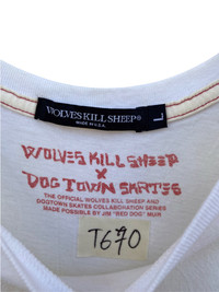 CODE ITEM: T670 (As a reference for the seller) Brand:WOLVES KILL SHEEP Made in:USA Size: L Please see manual measurement) Armpit: 19 inches Lenght: 29 inches Waist: inches Arm lenght: inches Shoulder : inches (all measurement on lying flat) Material: 100%cotton Please see all the picture for more detail. *Please provide telephone number after purchase, We need to fill the postage form for delivery process. Thank you