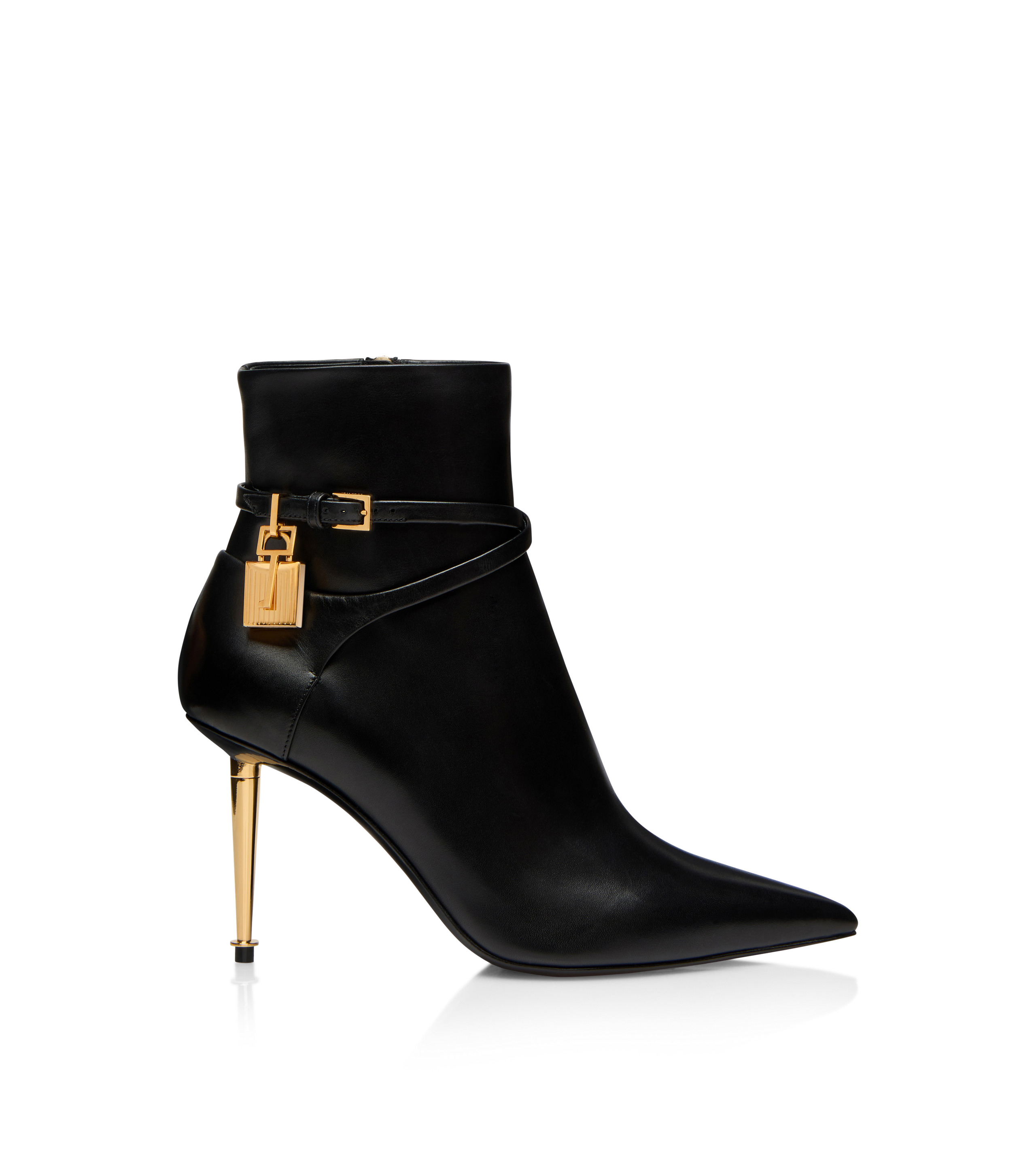 - POINTY TOE SHAPE - SIGNATURE PADLOCK METAL HARDWARE - 85 MM ICONIC METAL SPIKE HEEL - ADJUSTABLE BUCKLE ANKLE STRAP - BUCKLES WITH ENGRAVED TOM FORD LOGO - LATERAL ZIP - LINING: BLACK LEATHER - INSOLE: BLACK LEATHER WITH GOLD EMBOSSED TOM FORD - SOLE: LEATHER - 100% CALFSKIN - MADE IN ITALY