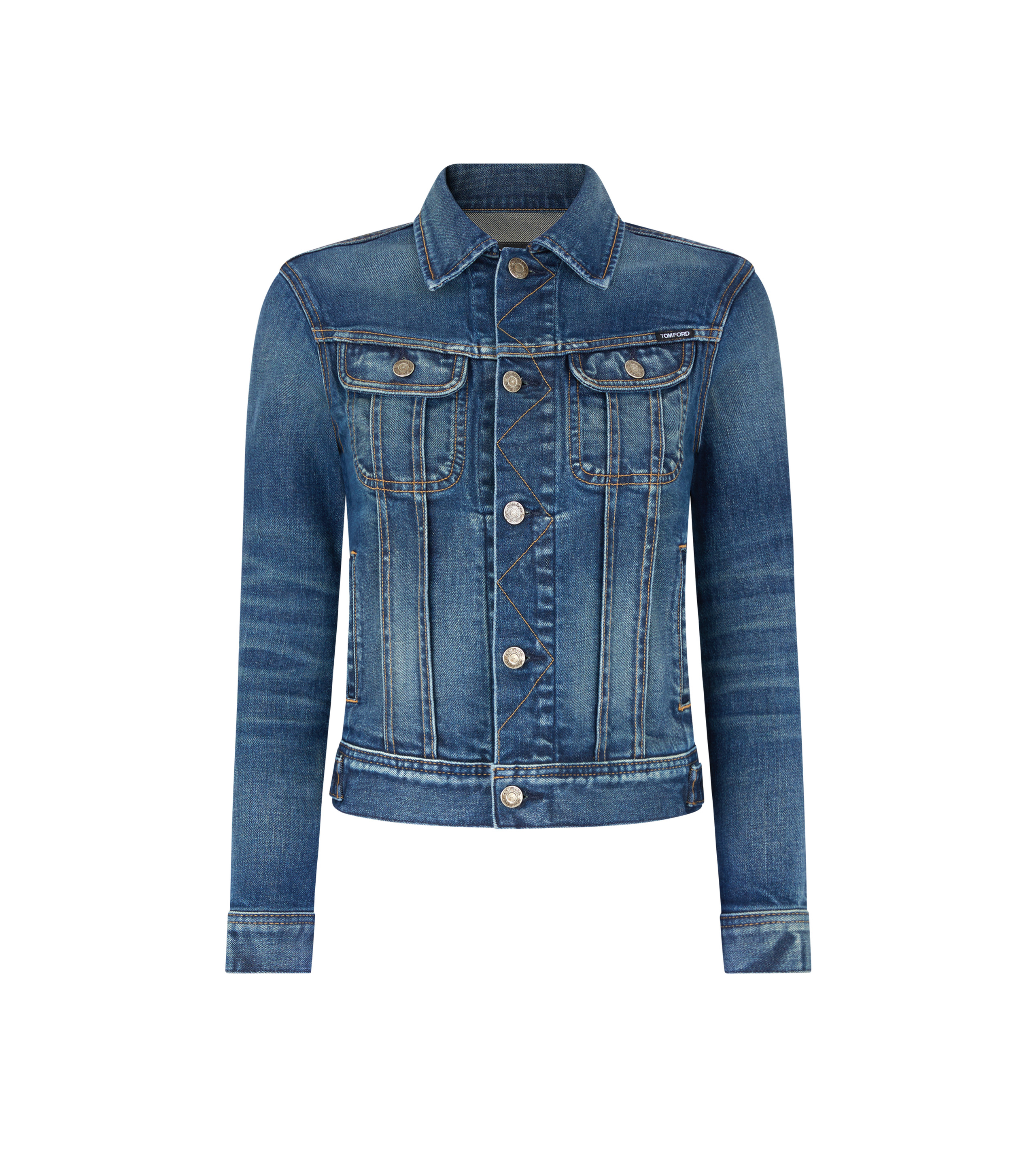- DENIM JACKET - PATCH FLAP CHEST POCKETS - SIDE POCKETS - BUTTONED CUFFS - TOM FORD SIGNATURE TUCK BUTTONS ALONG FRONT OPENING, POCKETS, CUFFS AND SIDE ADJUSTERS - TOM FORD EMBOSSED ALCANTARA LABEL ON THE BACK - ANTIQUE SILVER HARDWARE - CRAFTED IN COMFORT STONE WASHED DENIM - ,98% COTTON 2% POLYURETHANE - MADE IN USA