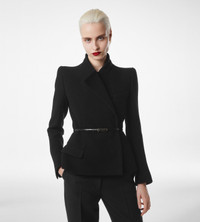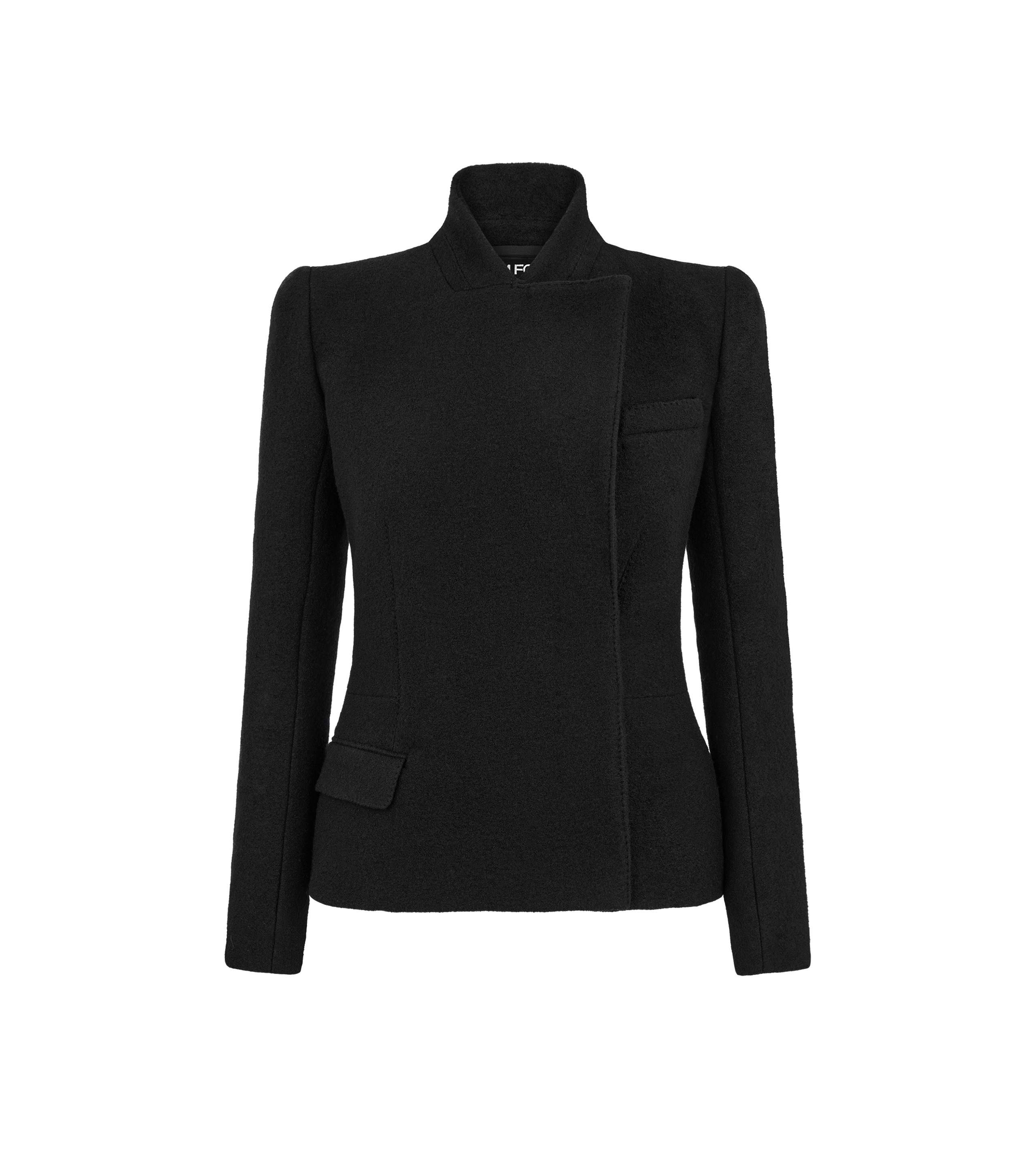 PRODUCT NO: GI3042-JEX178 Crafted in compact stretch boucle, this double breasted wrap jacket has fabric that incorporates elastic fibers, allowing comfort and ease of movement. Made with a tailored fit, features a plastron internal construction, moulded shoulder pads, and slightly curved sleeves for refined structure. Concealed front buttons and a back belt loop offer functionality, while a handmade chest pocket and a front flap pocket, plus signature horn buttons, reflect craftsmanship. AMF stitching details, a single vent, full lining, and TOM FORD’s precise tailoring complete the design. Alterations are complimentary in store, whether you purchase online or in person. Contact our Customer Care to reserve your fitting appointment. Composition: 100% virgin wool with lining made of 92% silk, 8% elastane, horn buttons Fit: tailored Made in Italy