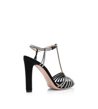 - ROUND TOE SHAPE - 105 MM HEEL - CAGE-EFFECT TOE - T-STRAP DETAIL - BUCKLE FASTENING ANKLE STRAP - LINING: NUDE LEATHER - INSOLE: NUDE LEATHER WITH BLACK HOT-STAMPED LOGO - SOLE: LEATHER - CRYSTAL STONES: 100% CRYSTAL - SUEDE LEATHER: 100% GOATSKIN - MADE IN ITALY