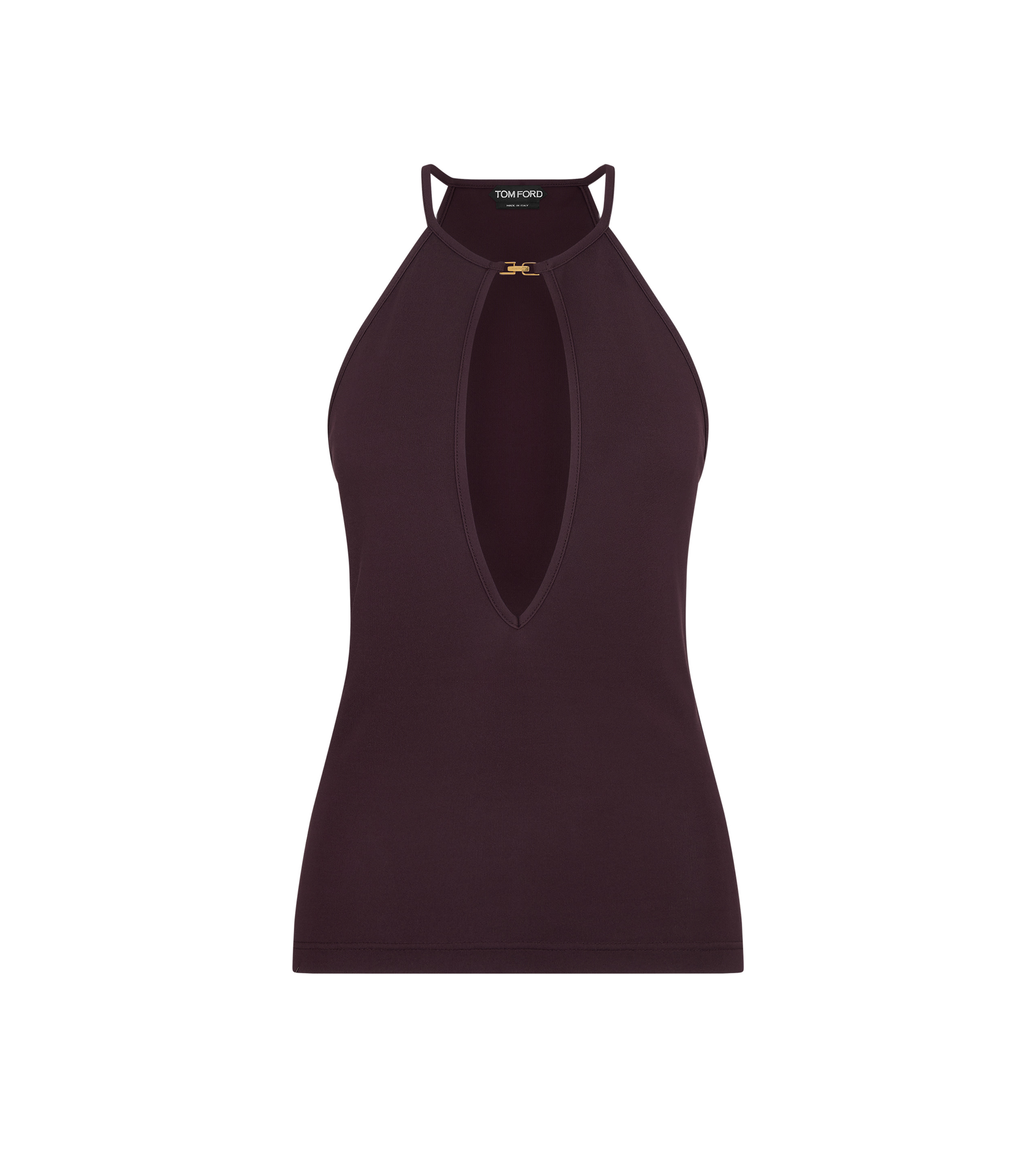 PRODUCT NO: TSJ623-JEX167 Minimal and powerful, this TOM FORD halterneck top reveals the body through a precise front cut-out, secured with a signature TF metal buckle. The deep neckline and fluid viscose crepe jersey complete the modern look. Composition: 100% Viscose Made in Italy