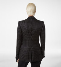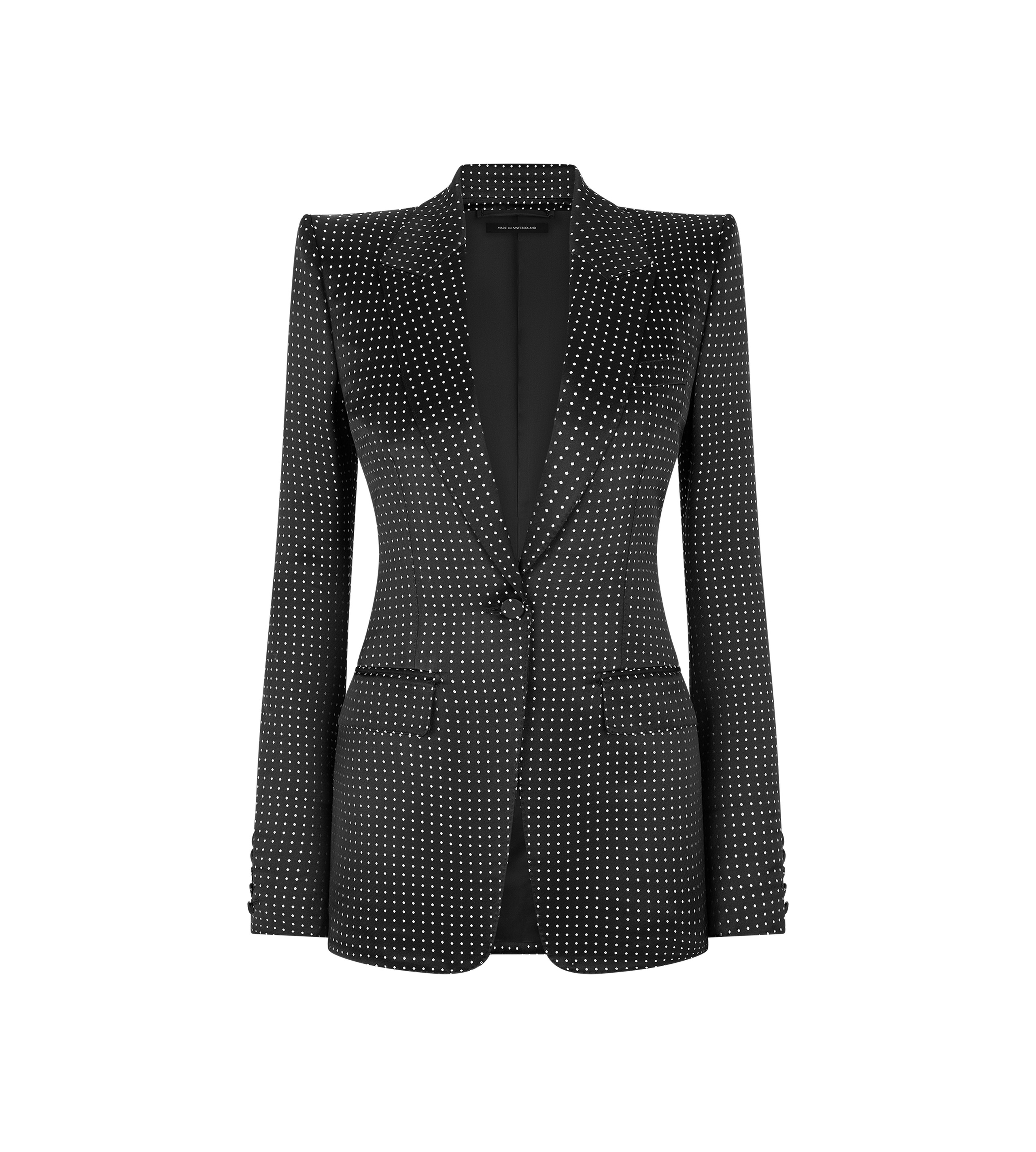 PRODUCT NO: GI3054-FAX1655 This single breasted jacket is crafted in jacquard polka dot duchesse for a lustrous feeling. Composed of a peak lapel, tailored shoulder pads, and a slightly curved sleeve, it features flap and handmade chest pockets with hand-stitched silk bar tacks. Five kissing cuff buttons, one of which is longer, as in all TOM FORD designs, frame the sleeve, while self fabric covered buttons line the front. It is finished with two internal jet pockets, a single vent, and a fully lined canvas construction for a precise, architectural silhouette. Alterations are complimentary in store, whether you purchase online or in person. Contact our Customer Care to reserve your fitting appointment. Composition: 100% silk with lining made of 59% cupro, 41% silk