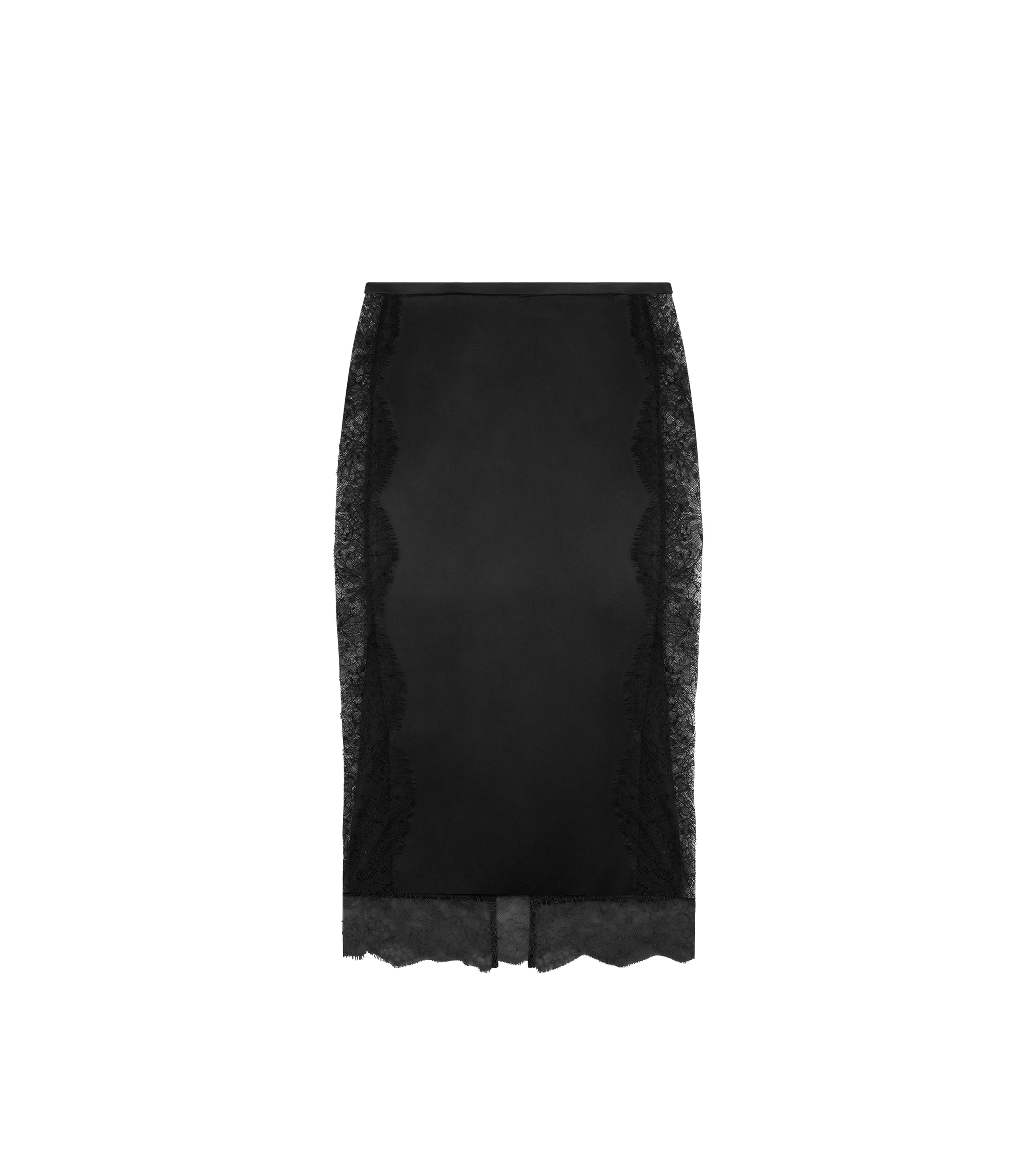 PRODUCT NO: GC5812-FAX1095 Romantic and bold—this TOM FORD skirt contrasts the soft sheen of stretch crepe satin with intricate Chantilly lace, with a daring look-through. Tailored for a close silhouette with a refined slit at the back. Composition: 93% silk, 7% elastane, trims: 51% polyamide, 49% viscose. Made in Italy.