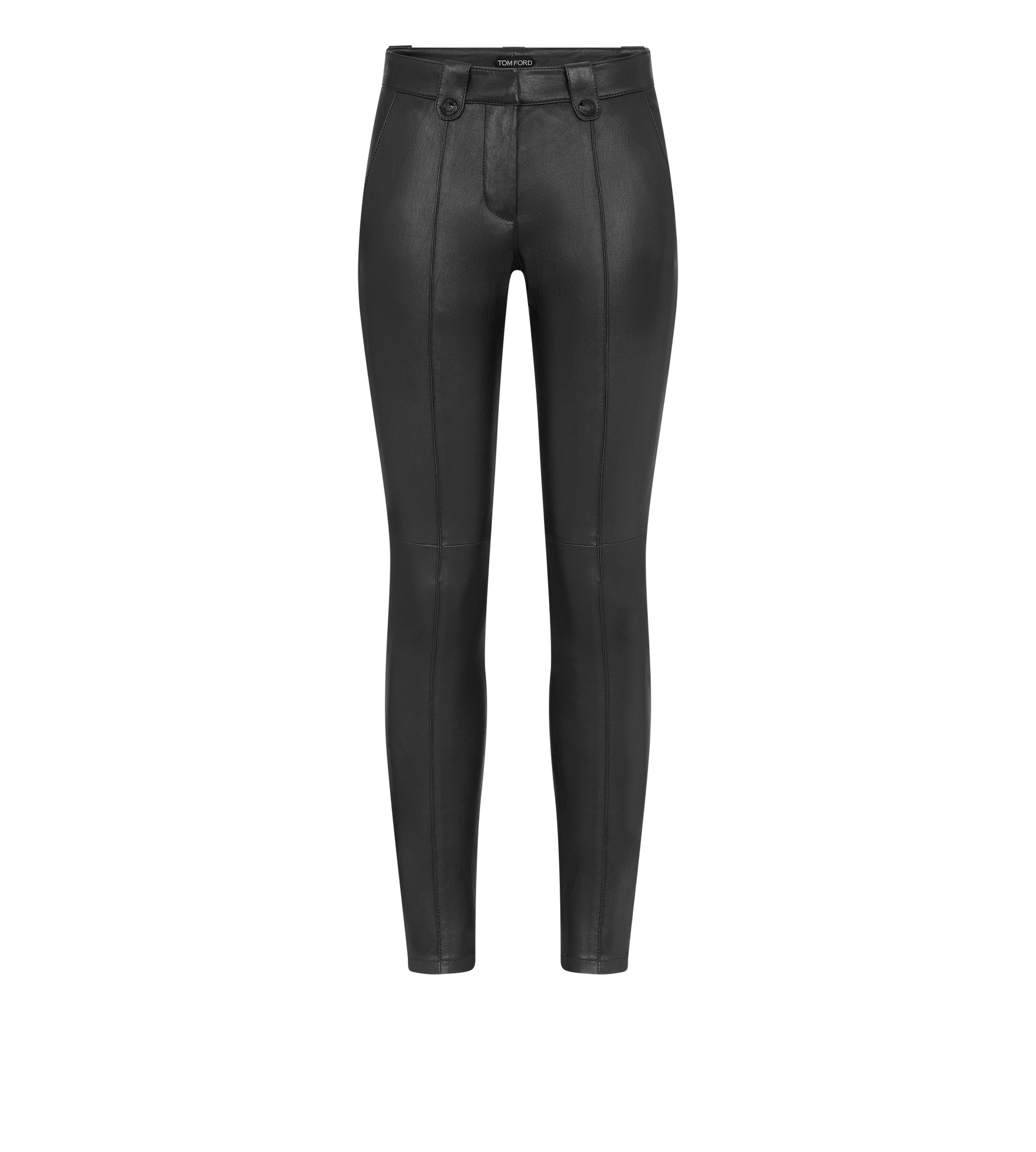 - LEGGINGS LEATHER PANTS - SKINNY LEGS - HOOK AND EYE AND ZIP FRONT CLOSURE - WAISTBAND LOOPS WITH TOM FORD SIGNATURE BLACK LACQUERED SNAPS - ZIPPED CUFFS - NON-FUNCTIONAL JET POCKET DETAILS ON THE BACK - RIB DETAILS ON CENTRE LEG FRONT AND BACK - CRAFTED IN STRETCH PLONGE' - 100% LAMB LEATHER - MADE IN ITALY