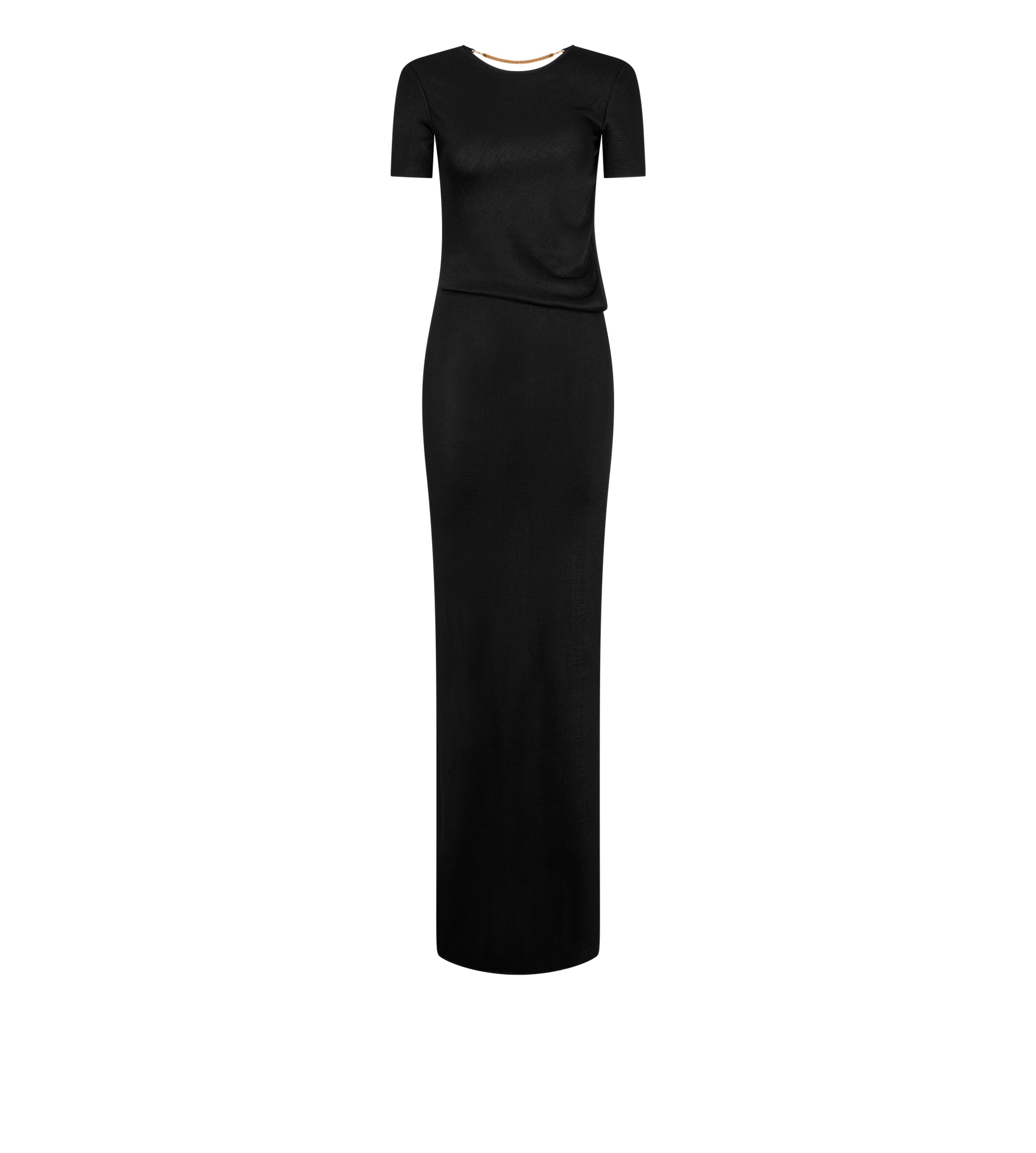 - SHORT SLEEVES ASYMMETRIC DRESS - FULL LENGTH - BACKLESS WITH CHAIN CLOSURE DETAIL - REMOVABLE CHAIN CLOSURE - CENTRE BACK SPLIT - AMBER VINTAGE GOLD METAL HARDWARE - CRAFTED IN LIQUID VISCOSE DOUBLE KNIT - GAUGE 12 - 100% VISCOSE