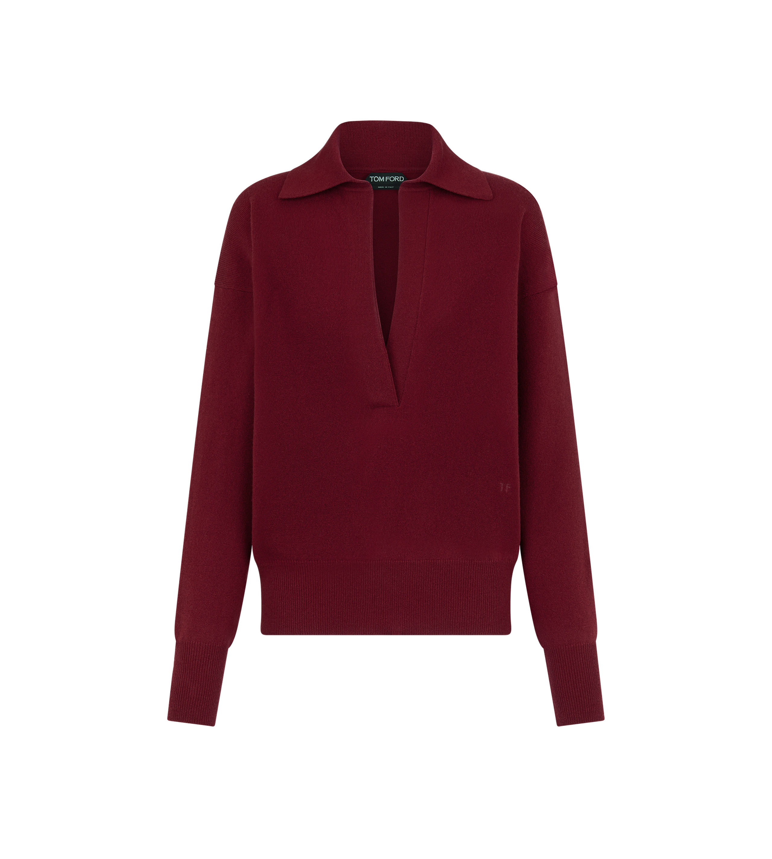 - LONG SLEEVE POLO - V-NECK - TONAL TF LOGO EMBROIDERY - RIBBED CUFFS AND HEM - CRAFTED IN FINE CASHMERE - 21 GAUGE - 100% CASHMERE