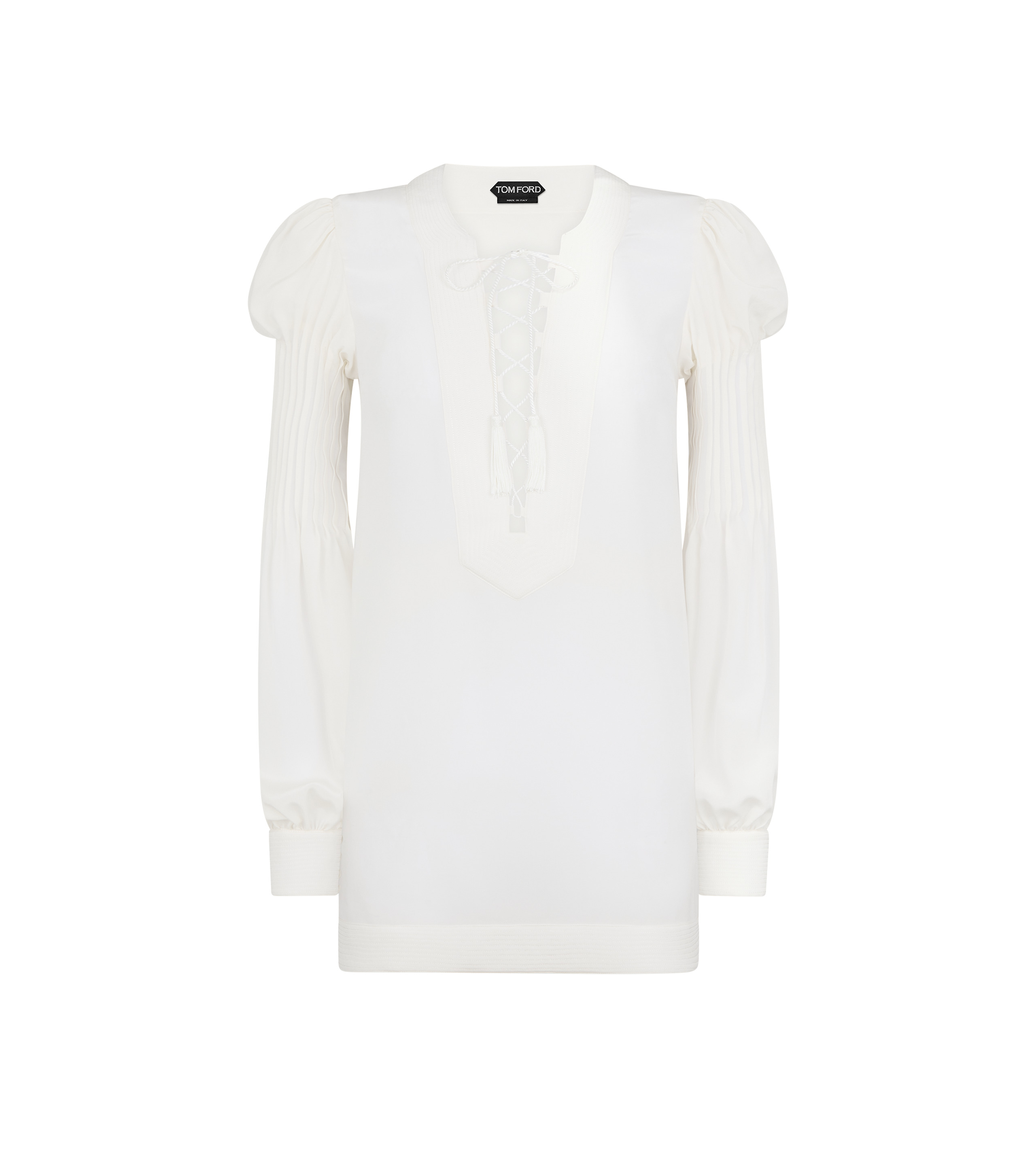- LONG SLEEVE MINI DRESS - DEEP V-NECK WITH CROSSOVER DRAWSTRING AND TASSEL DETAILS - MULTISTITCHING EMBROIDERY ALONG NECKLINE, CUFFS AND HEM - PUFFED EPAULETTES - CRAFTED IN SILK CREPE DE CHINE - 100% SILK