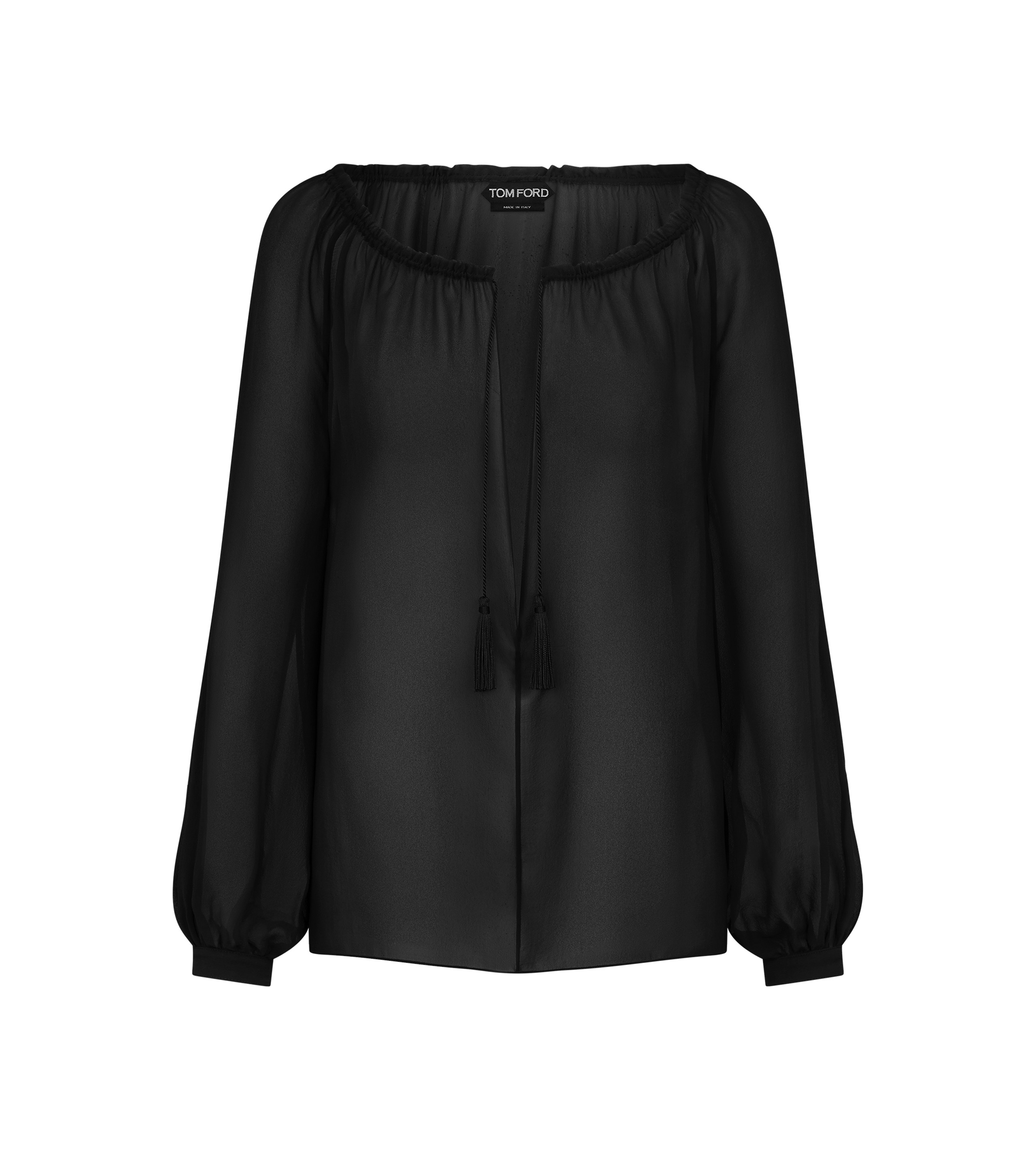 - FLUID FIT BOAT NECK BLOUSE - DEEP NECK OPENING WITH DRAWSTRINGS - SLIGHTLY PUFFED SLEEVES ABOVE CUFFS - SELF COVERED BUTTONS ON CUFFS - CRAFTED IN SILK GEORGETTE - 100% SILK