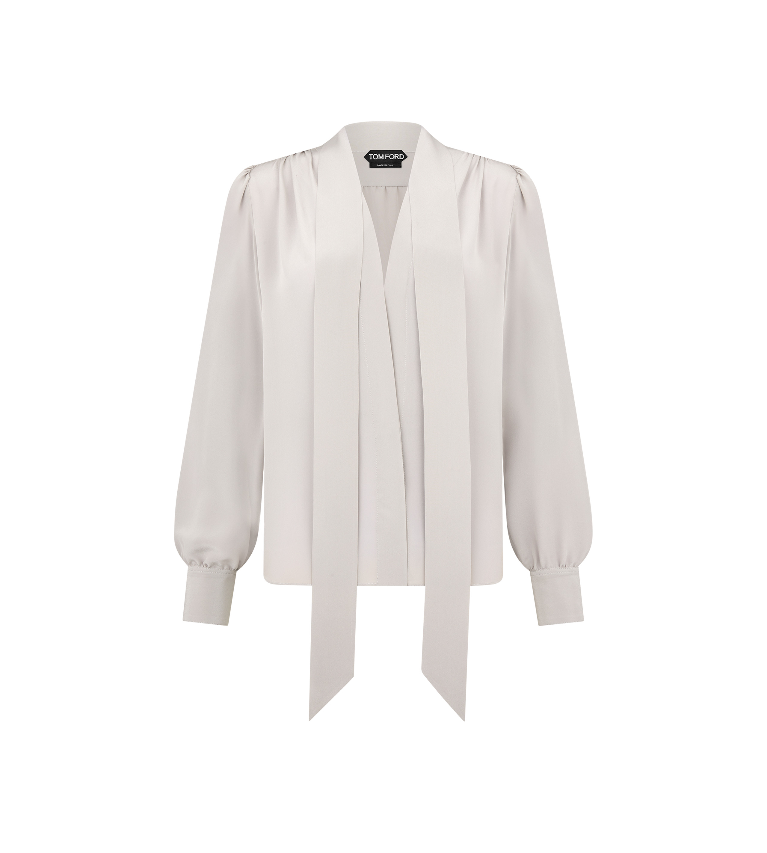 - LONG SLEEVE V-NECK LAVALLIERE BLOUSE - LONG NECK TIE - SLIGHTLY GATHERED ON THE SHOULDER AND SLEEVE - GATHERED BACK YOKE - MOTHER OF PEARL BUTTONS ALONG FRONT PLACKET - METAL HOOK AND EYE CLOSURE AT THE NECKLINE - COVERED BUTTONS ON THE CUFFS - CRAFTED IN SILK CREPE DE CHINE - 100% SILK