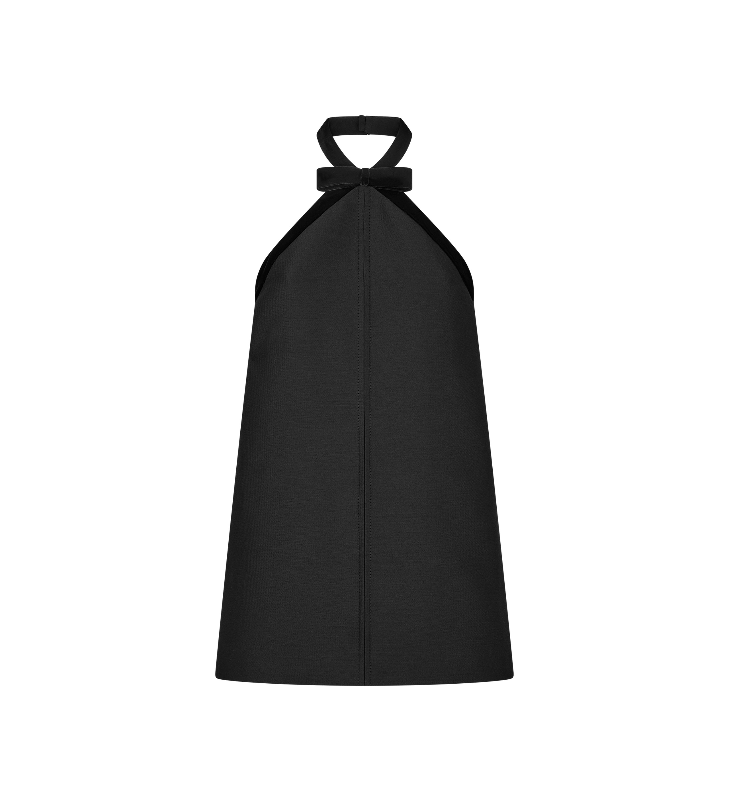 - A-LINE MINI COCKTAIL DRESS - BOW DETAIL ON COLLAR - VELVET FINISH ON TOP HEM AND NECKLINE - CENTRE BACK INVISIBLE ZIP CLOSURE - FULLY LINED - INTERNAL LEATHER CONSTRUCTION WITHIN THE BOW FOR REINFORCEMENT - CRAFTED IN WOOL AND SILK CREPE COUTURE - 75% WOOL 25% SILK