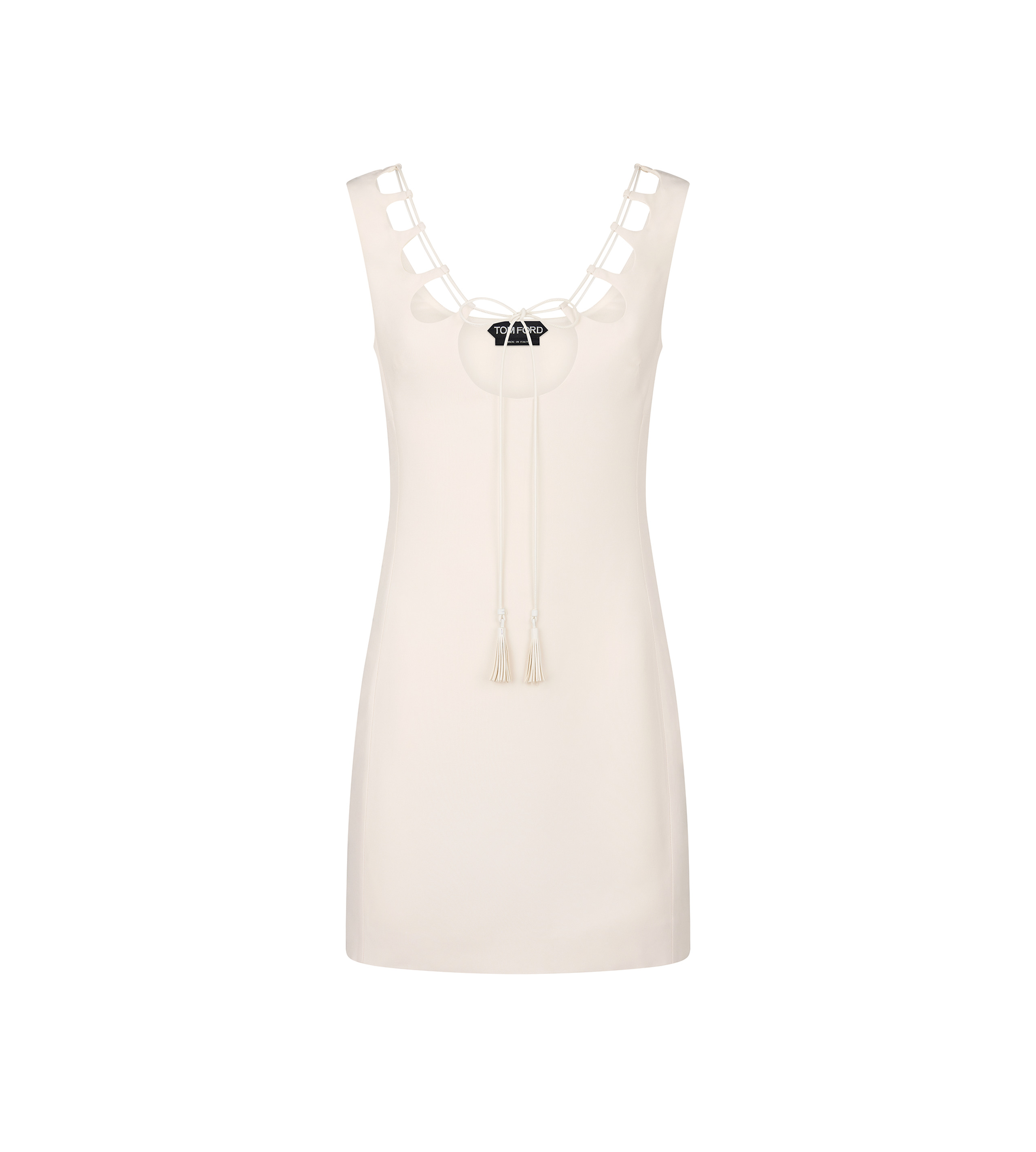 - SLEEVELESS COCKTAIL MINI DRESS - CUT OUT NECKLINE WITH ROUND DETAILS - LEATHER DRAWSTRING WITH TASSELS AROUND COLLAR - INVISIBLE ZIP OPENING - CRAFTED IN ROUND VISCOSE SABLE - 100% VISCOSE