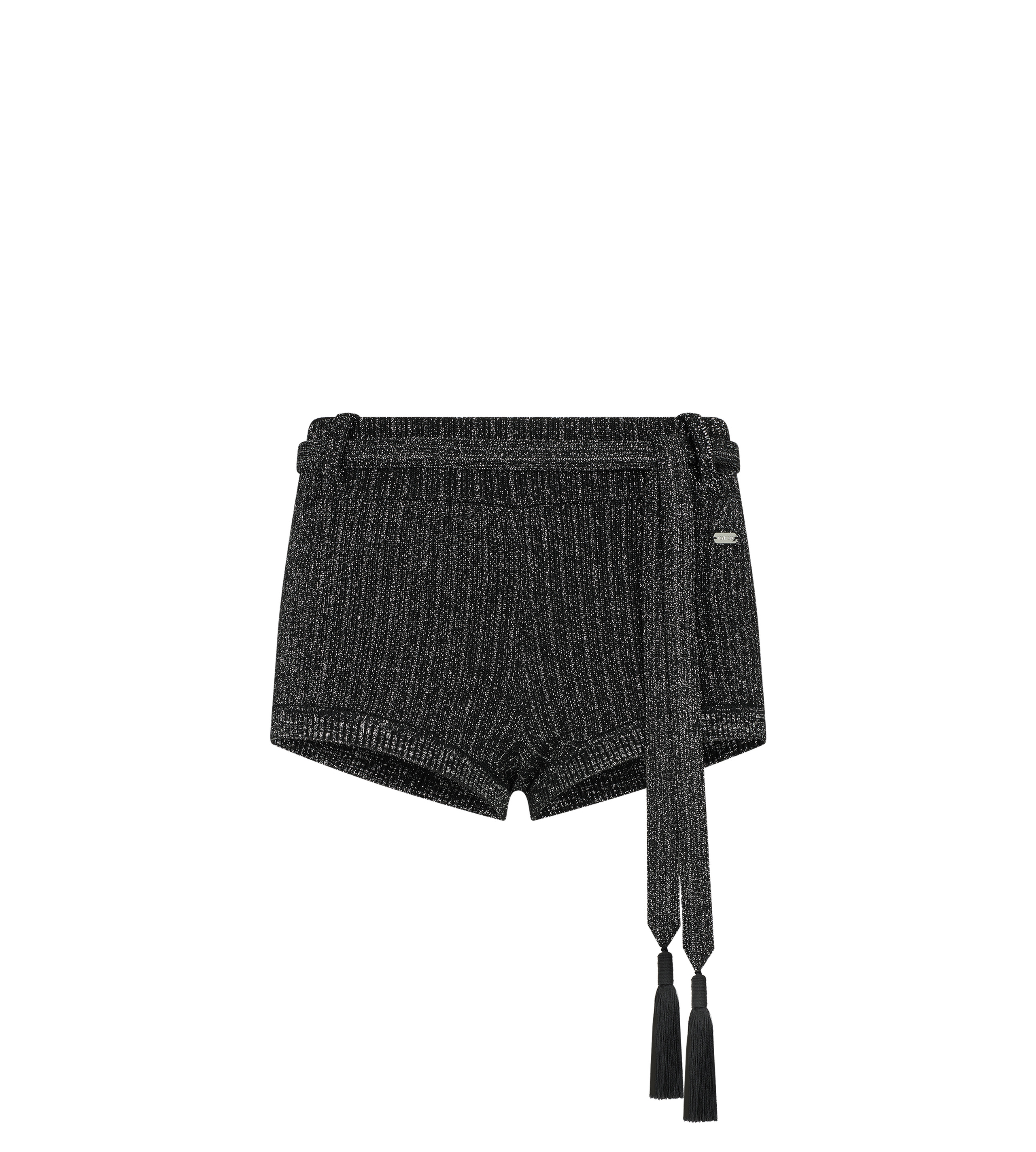 - KNITTED MINI SHORTS - TOM FORD LOGO METAL PLAQUE - SELF BELT WITH TASSELS - BELT LOOPS - CRAFTED IN VANISE' VISCOSE LUREX RIB - 14 GAUGE - 67% VISCOSE 15% METALLIC POLYESTER 16% POLYAMIDE 2% POLYURETHANE - MADE IN ITALY