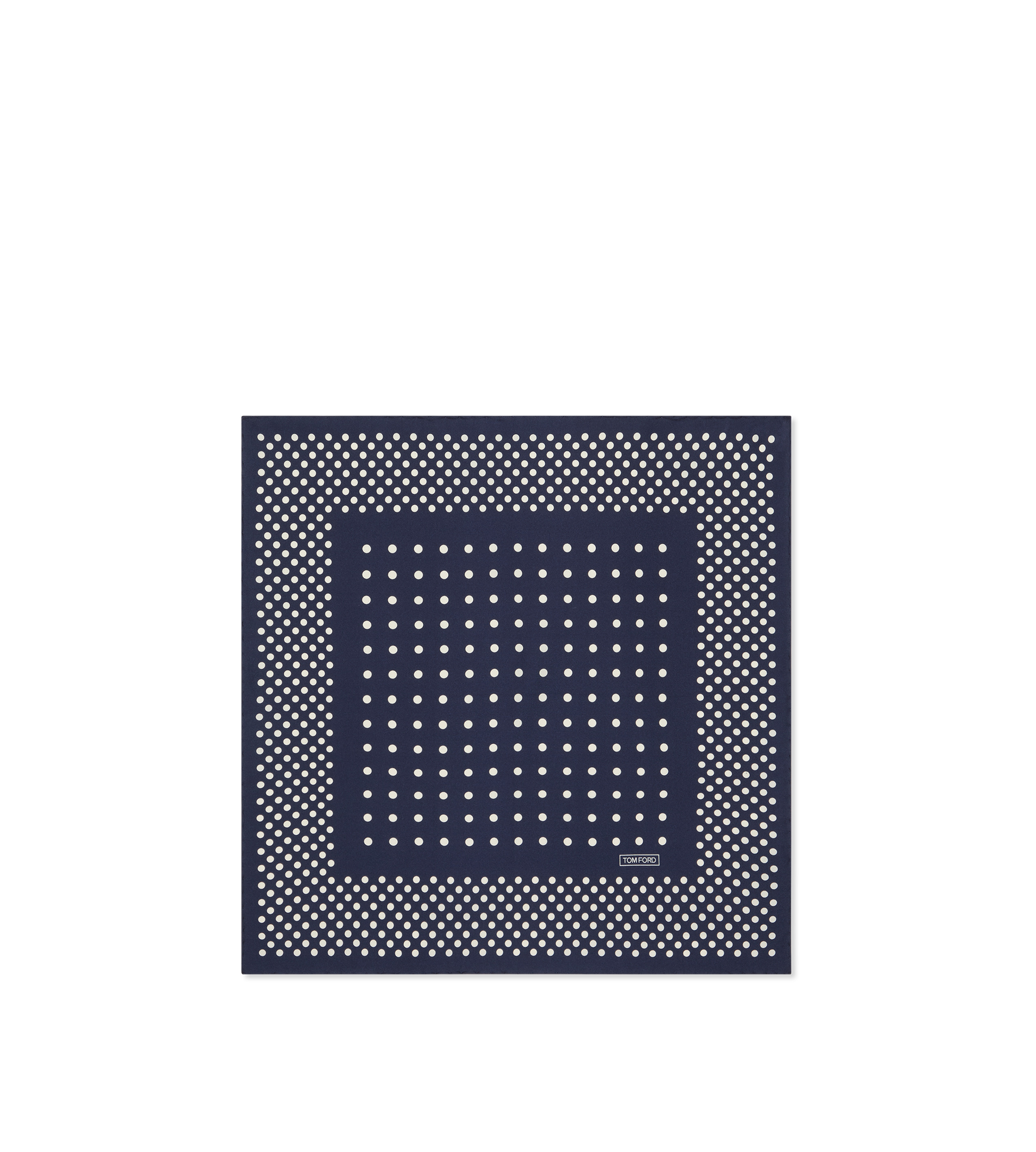 PRODUCT NO: SPR001-S0144 A refined TOM FORD pocket square crafted in pure mulberry silk. The framed polka dot motif adds elegance and uniqueness. Composition: 100% mulberry silk. Made in Italy.