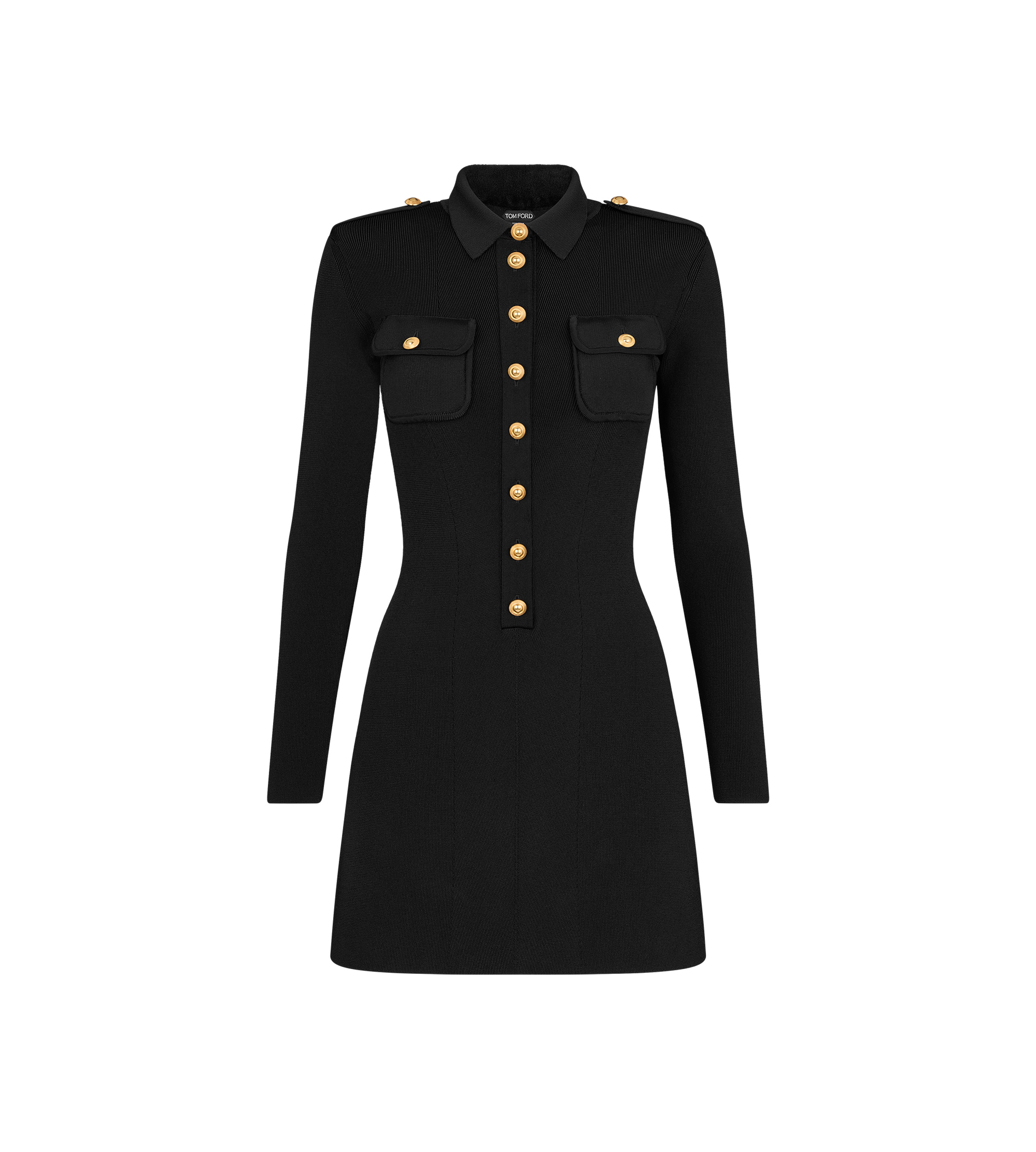 - LONG SLEEVE KNITTED MINI DRESS - SHOULDER EPAULETTES - SHOULDER PADS - POLO NECKLINE DEEP BUTTONED PLACKET - CHEST FLAP POCKETS - AMBER VINTAGE GOLD OR PALE GOLD METAL BUTTONS ALONG EPAULETTES, POCKETS AND PLACKET - CRAFTED IN RIBBED STRETCH SLINKY VISCOSE - GAUGE 14 - 67% VISCOSE 31% NYLON 2% POLYURETHANE