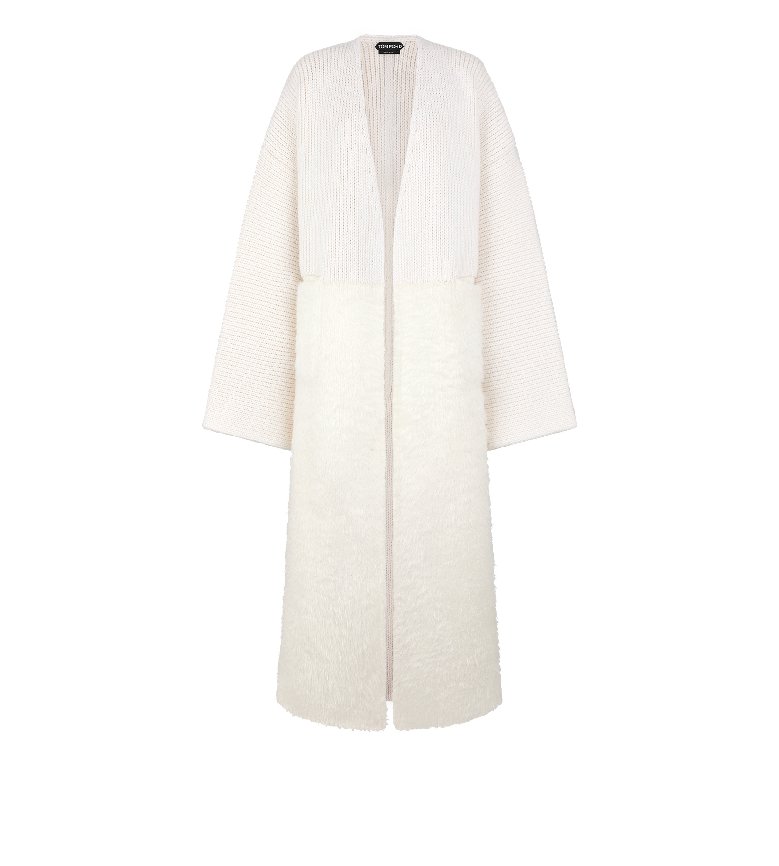 - SCULPTURAL MAXI COAT - SINGLE BREASTED - COLLARLESS - ARCHITECTURAL VOLUME - PATCH POCKETS - DOUBLE FACED AND EXTRA LONG SILK HEM - CRAFTED IN DOUBLE FACE WOOL, CASHMERE AND SILK BLEND